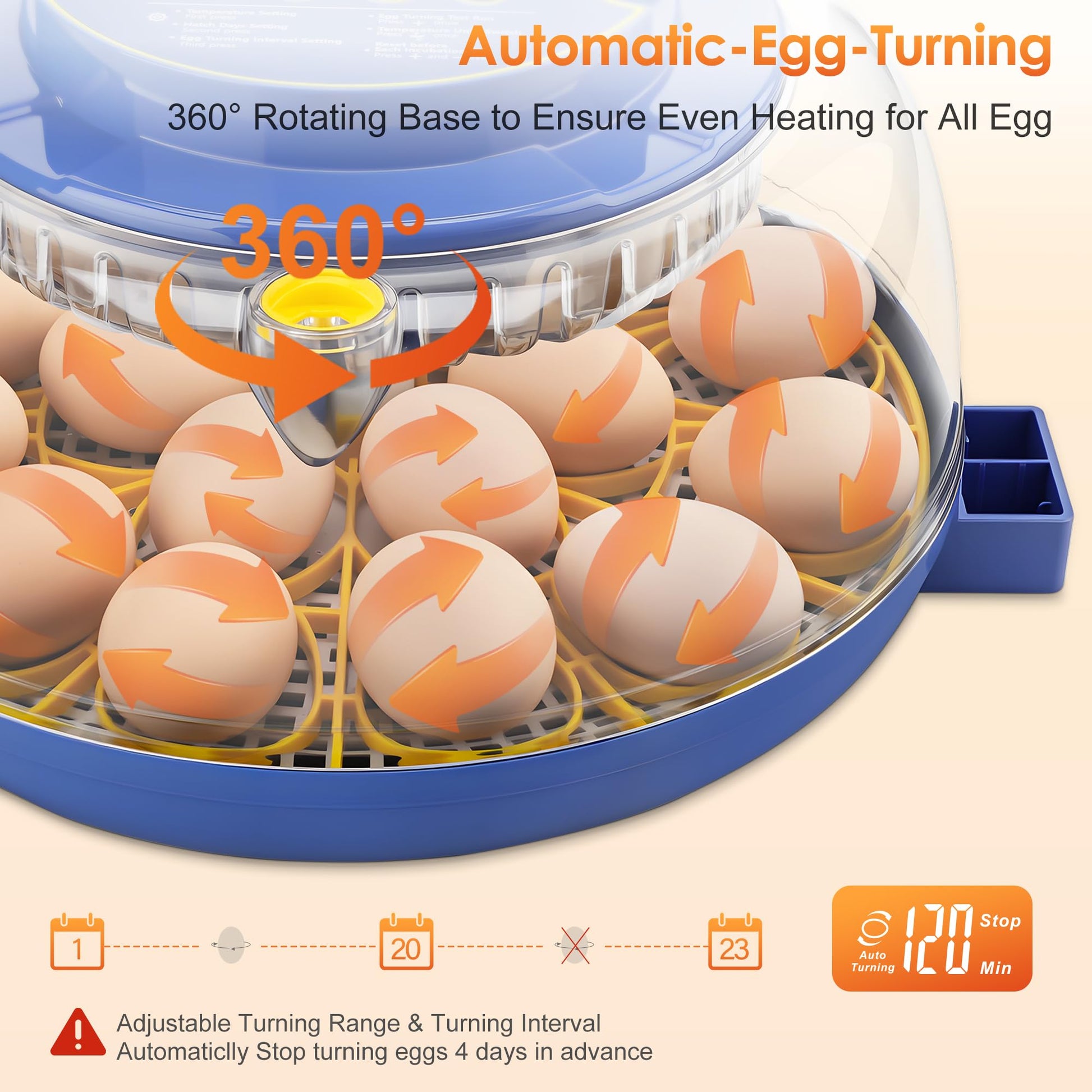 【Automatic Egg Turner for Even Warmth】 Egg incubator with automatic egg turner to Mimic Natural Incubation and promotes the healthy development of eggs. The egg-turning motor of the chicken incubators for hatching eggs will stop working automatically in the last 4 days to prevents rotation injuries during hatching. Please take out the egg tray and place the eggs on the grid gently so that there is enough space for the chicks to come out of the shell.(Adjustable range : 60, 120, 180 (minutes))