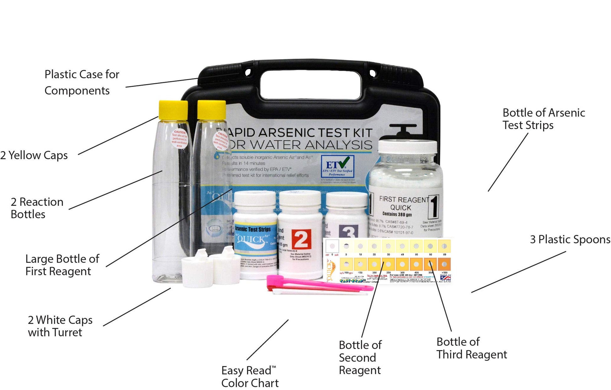 ✔COMPLETE KIT: Plastic Black Case contains 3 Reagents, Easy Read Color Chart, 3 Plastic Spoons, 100 Arsenic Test Strips, 2 Reaction Bottles, 2 Yellow Caps, 2 White Caps With Turrets