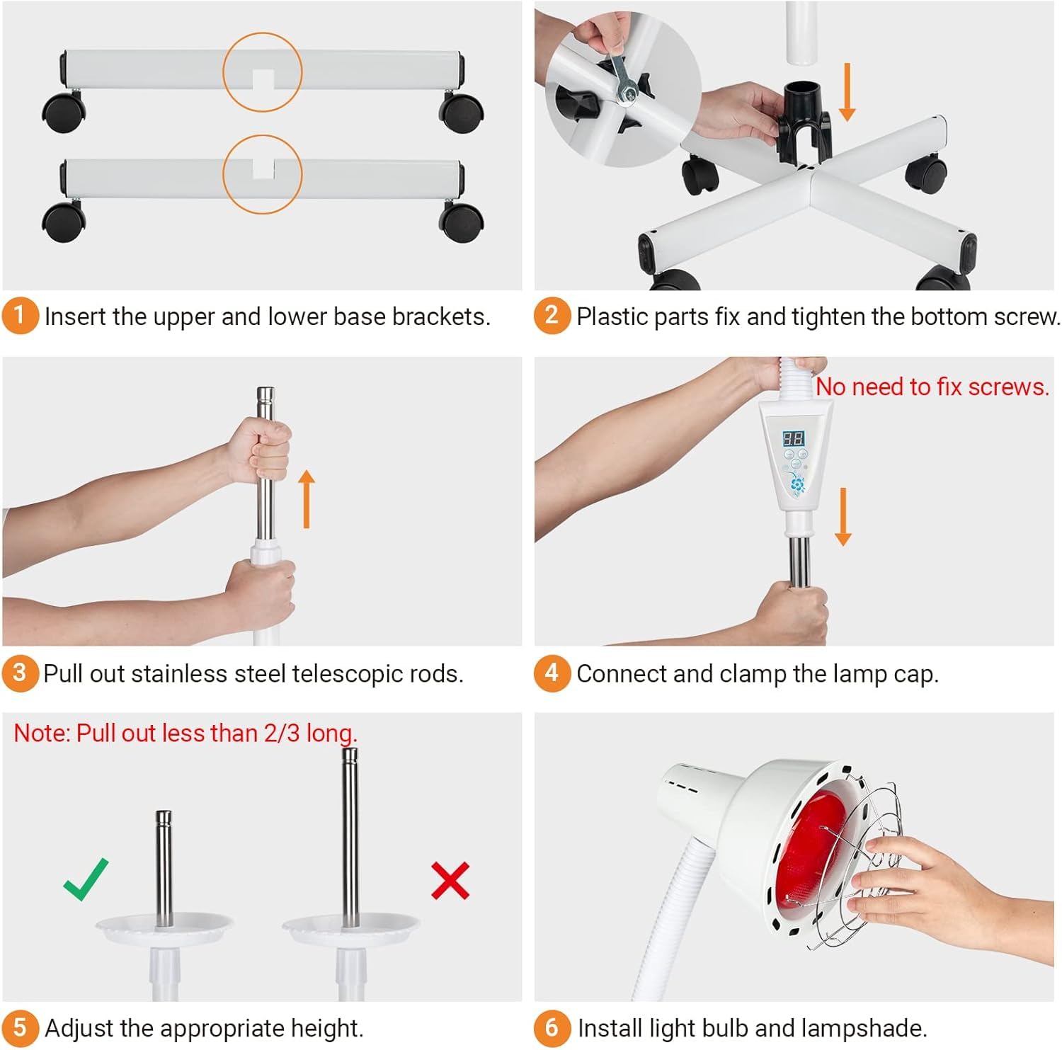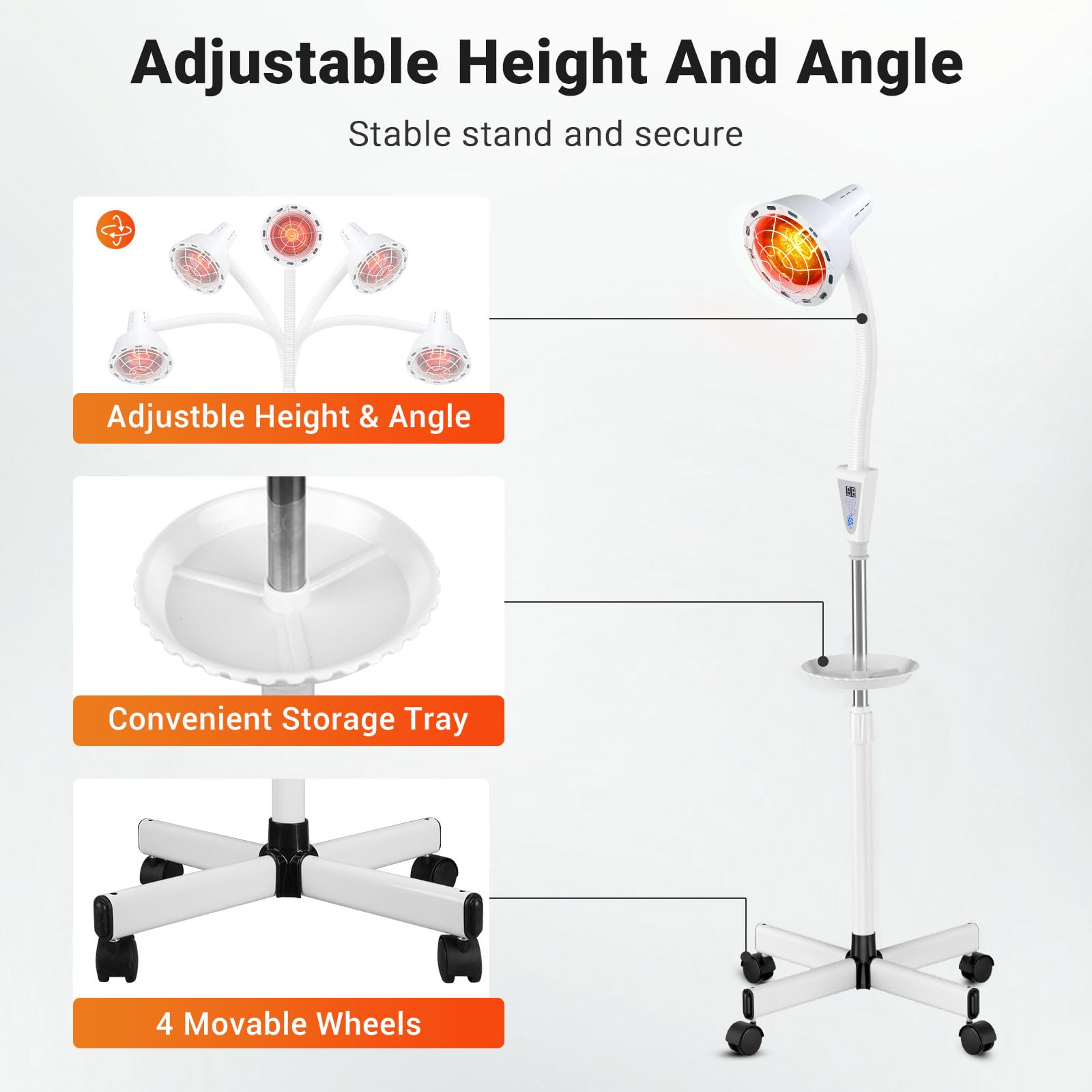【Infrared Heating Lamp with Bracket】: The temperature of the infrared treatment lamp can be freely adjusted. Infrared therapy lamp has a time adjustment function of 5-60 minutes, and there are ten levels of temperature adjustment from 1 to 10, allowing you to experience treatment at different temperatures. This near-infrared light with a timer can help relieve pain During treatment, it is necessary to maintain a distance of at least 18 inches from the heating lamp.