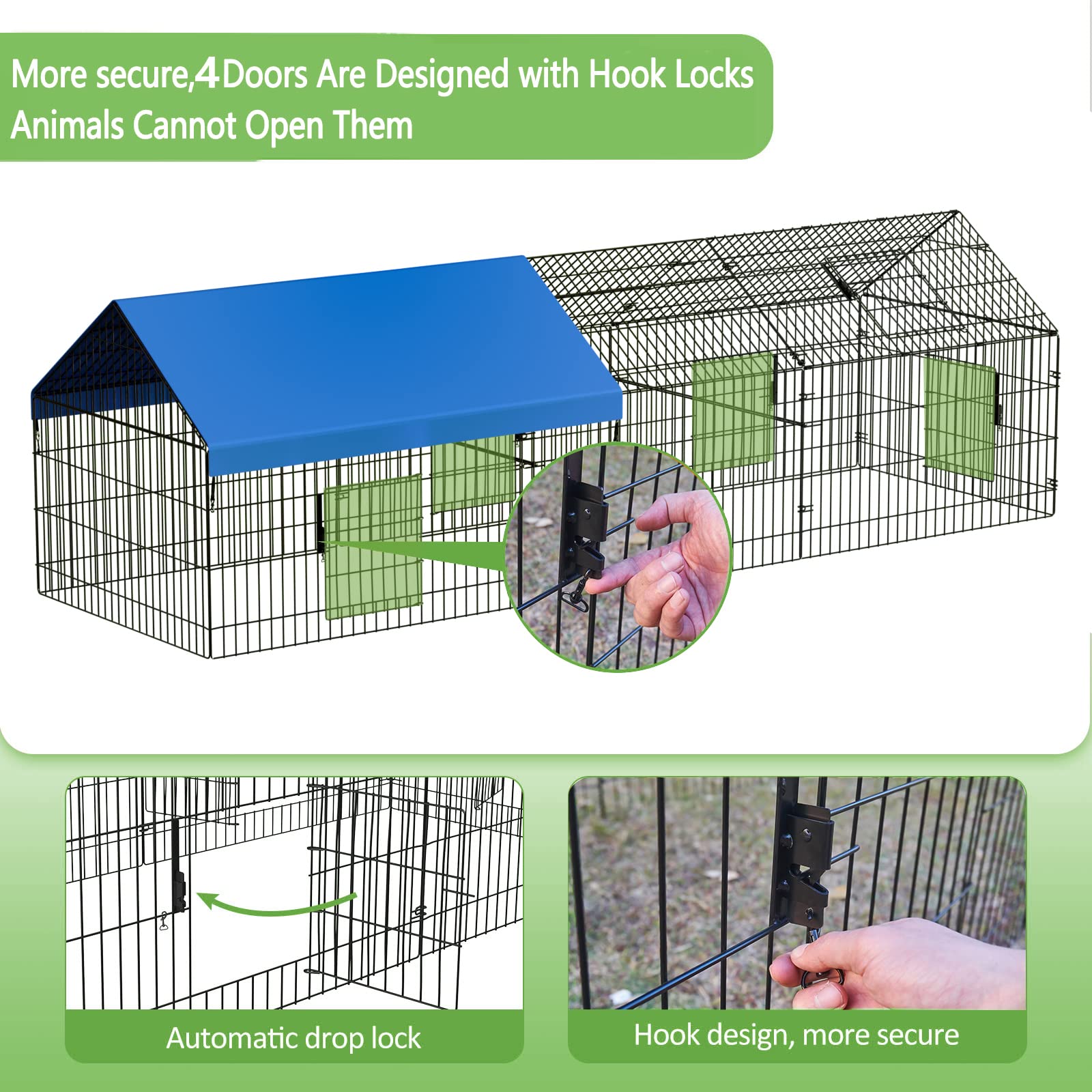 Spacious Space: This 130" x 40"W x 39"H large size chicken pen offers plenty of room for your chickens and pets, this coop is big enough for 8-12 hens. There are 4 doors around the coop for pets to enter easily, and 1 door at the top for your feeding