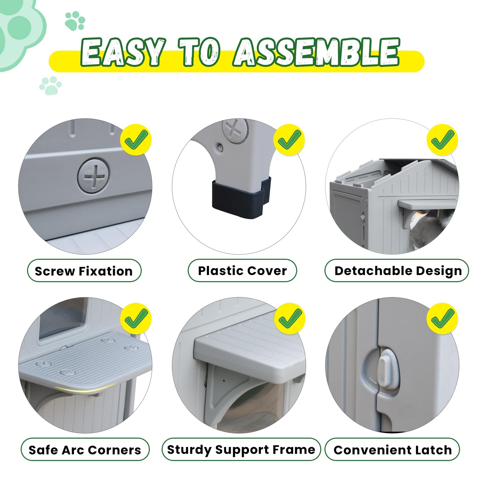 【Sturdy Construction】Constructed from thick, durable plastic, the cat house is weather-resistant. The PVC door curtain effectively blocks wind and rain.