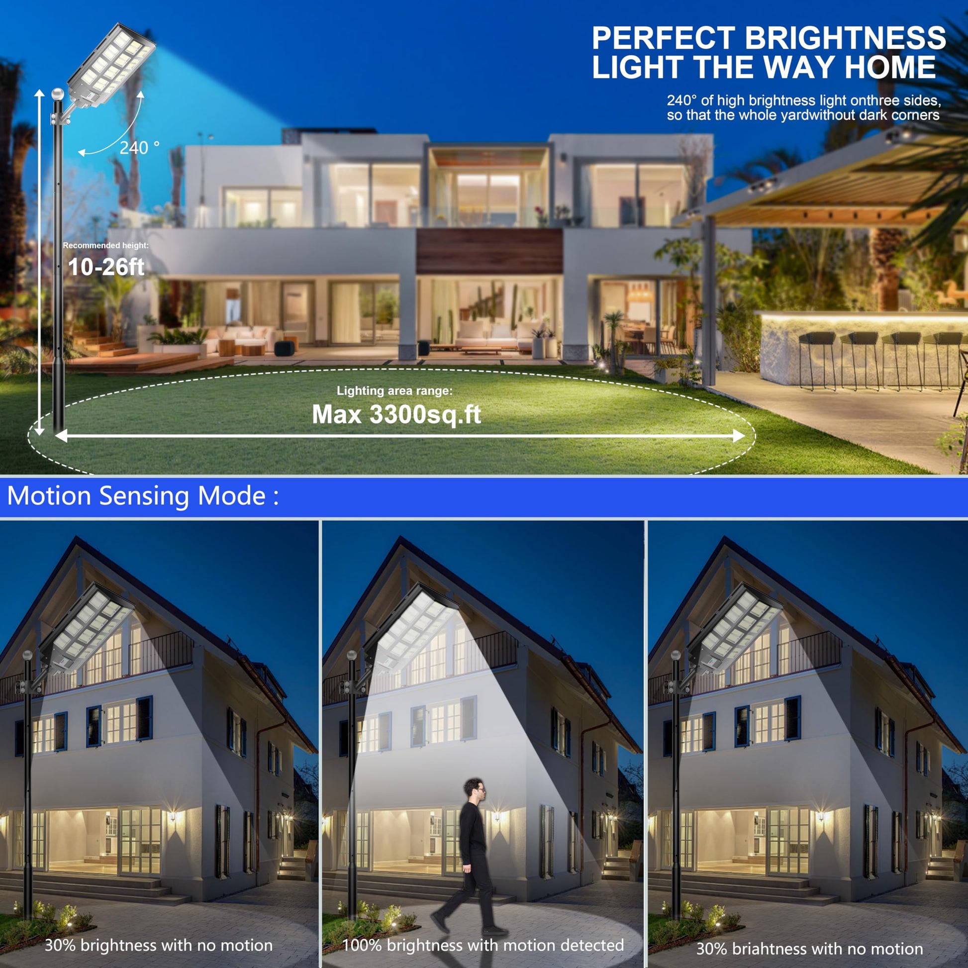 đĄăPerfect for Residential and Commercial UseăWhether you need lighting for your home or a commercial property, this solar street light is versatile and suitable for various applications. It's an excellent choice for driveways, parking lots, pathways, and more. Enjoy bright and worry-free lighting with zero electricity costs and an impressive 300000 lumens of radiant brightness.