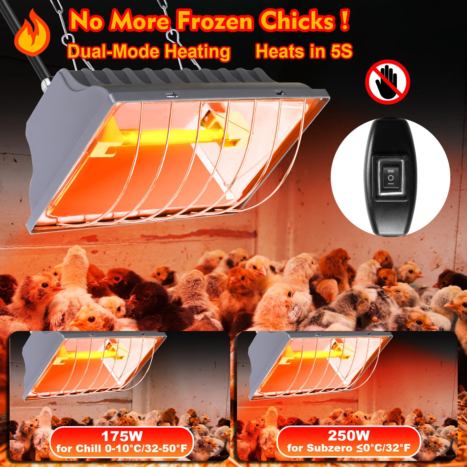 đăTwo Adjustable TempăJaenmsa winter-proof chicken coop heater designed with 2 mode,the 250W(high)for the Subzero days(â€32°F), 175W(low) for Chill days(32-50°F),ensuring optimal warmth without overconsumption.