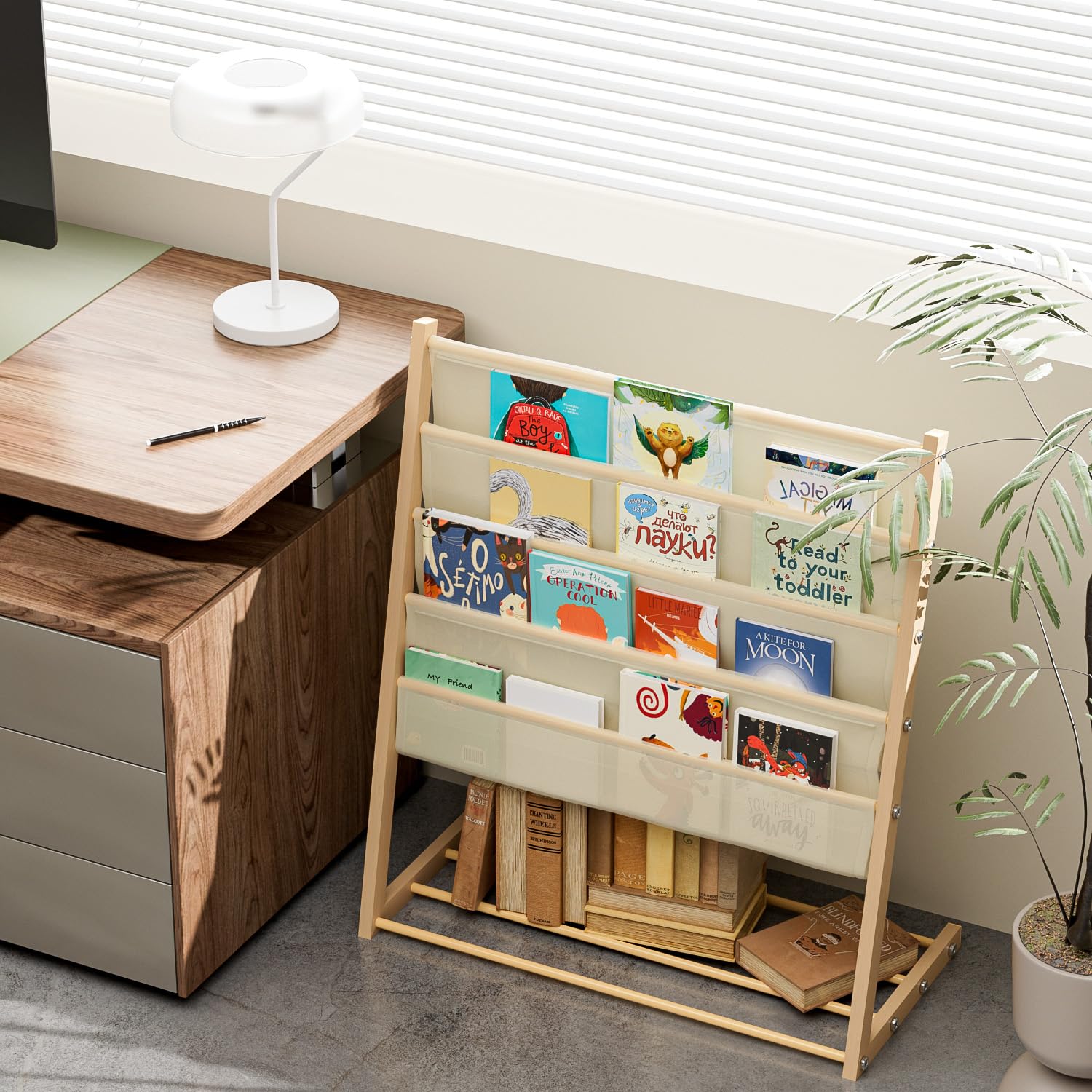 Durable & Child-Safe Design: Our toddler bookshelf features sturdy metal construction covered in a fabric woodgrain textured finish, ensuring safety and longevity for toddlers and babies.