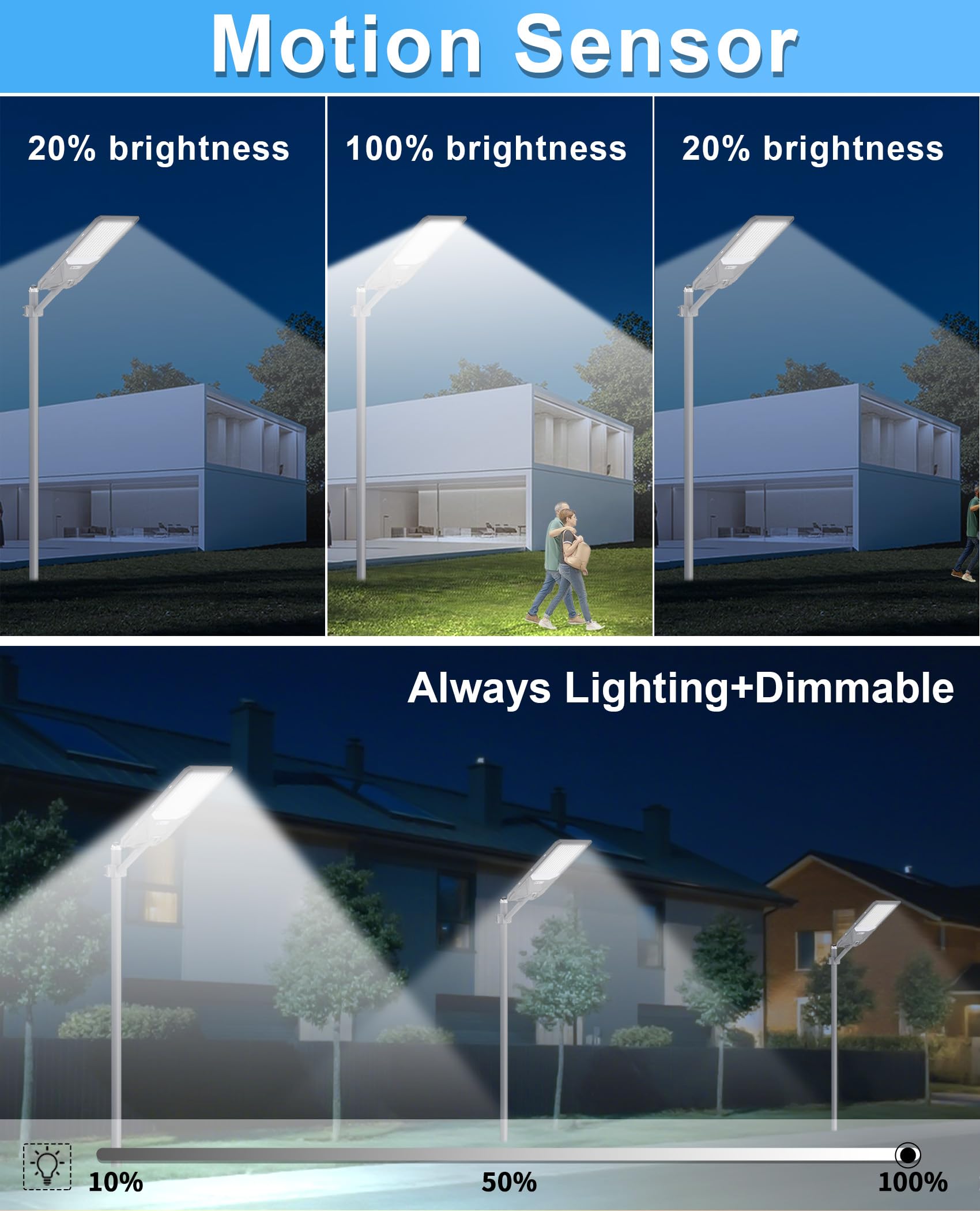 【4 LIGHTING MODES】This solar street lights outdoor waterproof have 4 different control modes. ①Dusk to Dawn Mode: street light automatically turn on at dusk and automatically turn off at dawn ②Motion Sensor Mode:keep 20% brightness, increases to 100% brightness when motion is detected, returning to 20% after 30 seconds.③Always Lighting Mode:Stay on at 10~100% brightness④Dimmable:Street lights outdoor can be dimmable, there are 10 levels of brightness that can be adjusted.