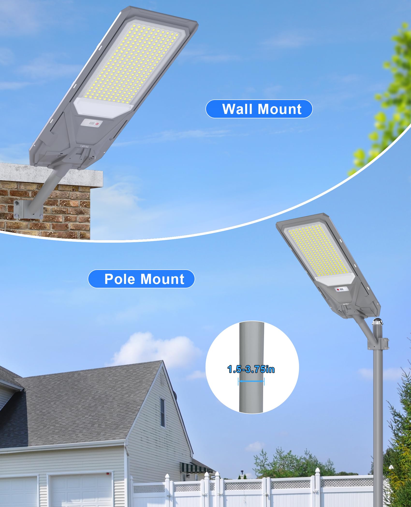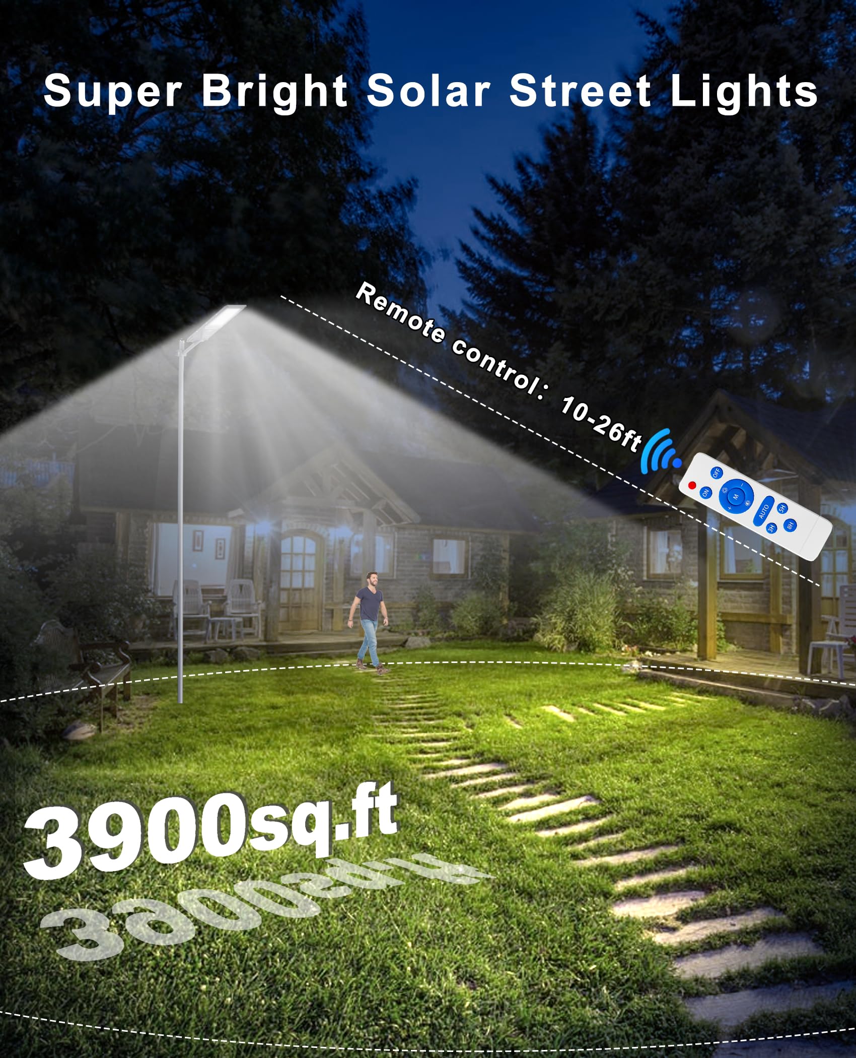 【WIDE ILLUMINATION AREA 】ALL in one design,comes with 180°wide-angle lighting,street lights solar powered with 6500k color temperature,it is no yellow and provided clear and bright vision., the Illumination area is up to max 3900sq.ft .We suggest you install our parking lot lights commercial 10-26ft above the ground. Support street light pole diameter 1.97"-3.54".