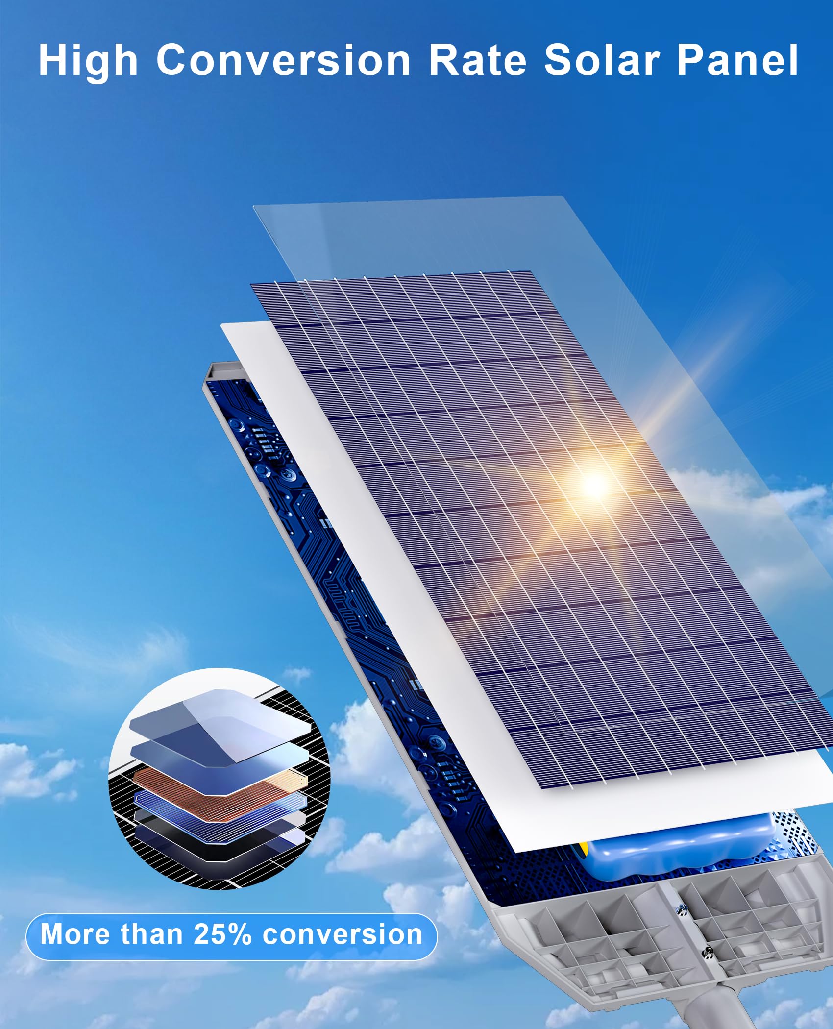 【0 ELECTRICITY BILL AND LONG WORKING TIME 】Built-in light sensor technology, solar power street lights charged at the daytime for 6-8 hours, the working time more than 27 hours. Equipped with a 36000mAh large capacity battery, easily storing power to maintain illumination throughout the night.led parking lot lights outdoor choose polycrystalline silicon solar panels, 25% conversion rate , which not only helps you save more than 90% of electricity costs, but also Provide brighter, more sustainable lighting effects.