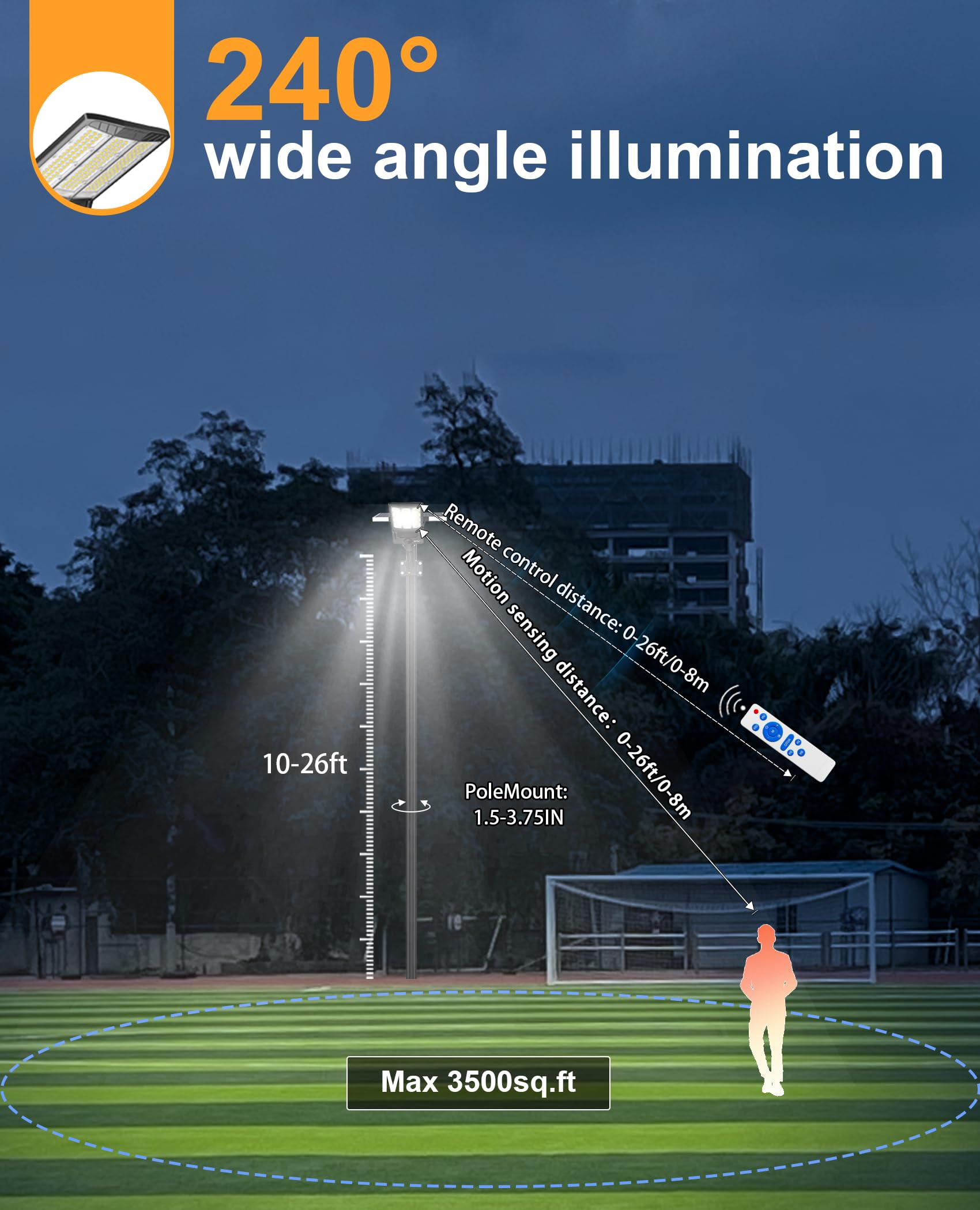 【TWO WORKING METHODS; NO MOTION SENSOR】This solar street lights outdoor waterproof have 2 different control modes. ① Dusk to Dawn Mode: street light automatically turn on at dusk and automatically turn off at dawn; ②Always Lighting Mode: solar street lamp stay on 100% brightness, there are 10 levels of brightness that can be adjusted.(Please note: there is no motion sensor in this lamp)