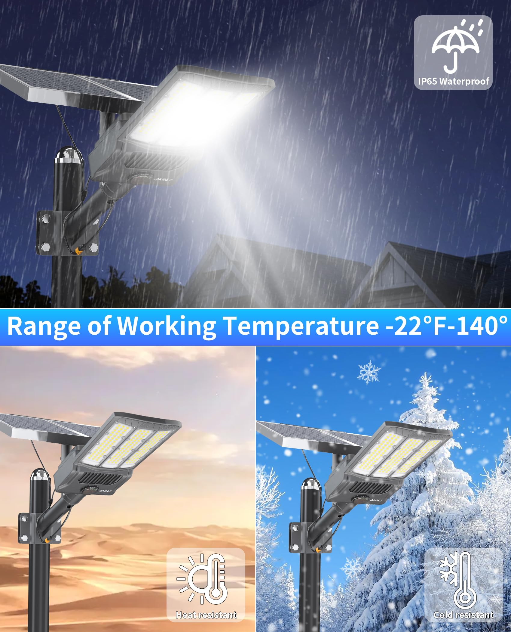 【HIGH LUMEN LED BEADS】This bright solar street light uses high brigh 144 pcs brightest 5054 type LED beads. Led beads build-in large chips and large battery capacity, can produce up to 900000LM high brightness output . LED beads also adopt convex lenses technology, make the light uniform, brighter and farther. solar powered Street lights with 6500k color temperature,it is no yellow and provided clear and bright vision.