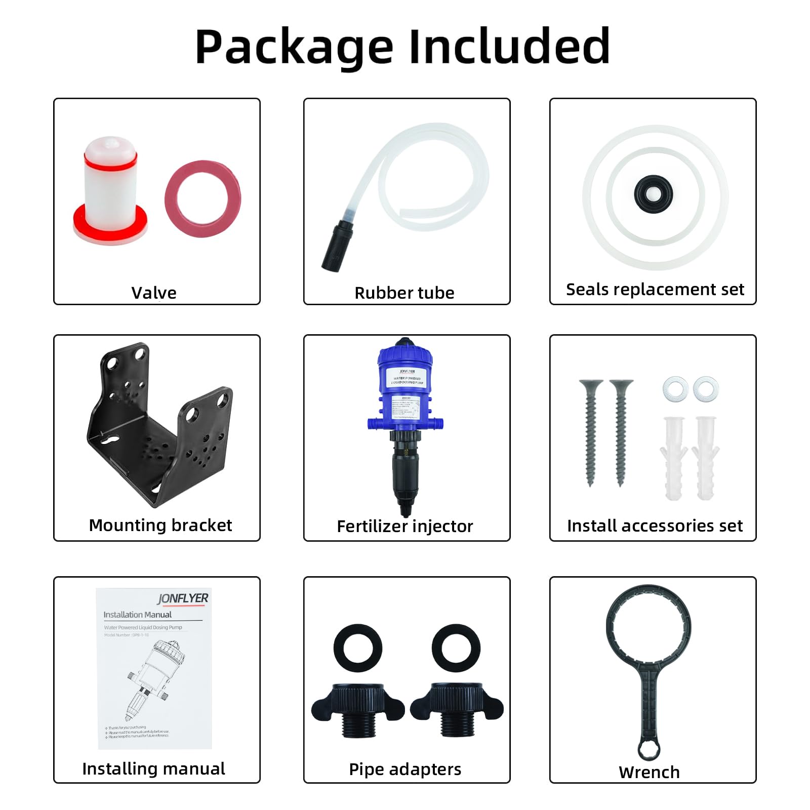 Water Powered Fertilizer Injector: POM housing,more strong,impact resistance,weather resistant and corrosion resistant;Upgraded inner structure and higher quality materrial seals,more stable for working;Attached specially designed one-way valve(can be installed on the pump inlet) to effectively prevent liquid backflow;Perfect for home growers and pros alike