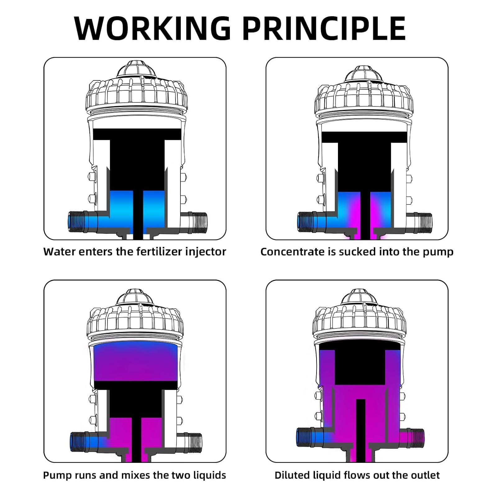 Easy to Use: Attach to water hose,set the dilution rate,turn on the faucet,the fertilizer injector will automatically and evenly mix the water and concentrate; Value for money,greatly saving your money for purchasing a more expensive one; If the item you received is a little wet,or has some sound during working,please be assured it's normal