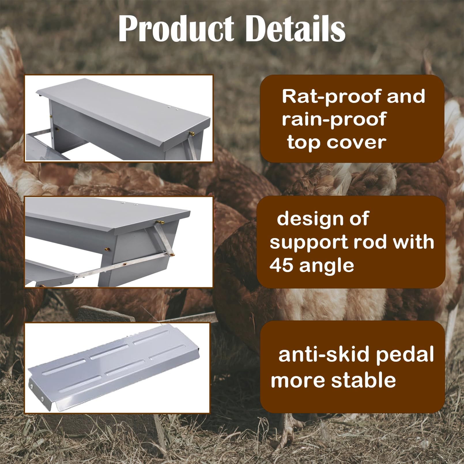 【Save money and Time】Outdoor automatic chicken feeder effectively reduces feed waste and prevents rodents and birds from stealing food.You can fill the Metal treadle chicken feeder with feed and then go on a one-week vacation!