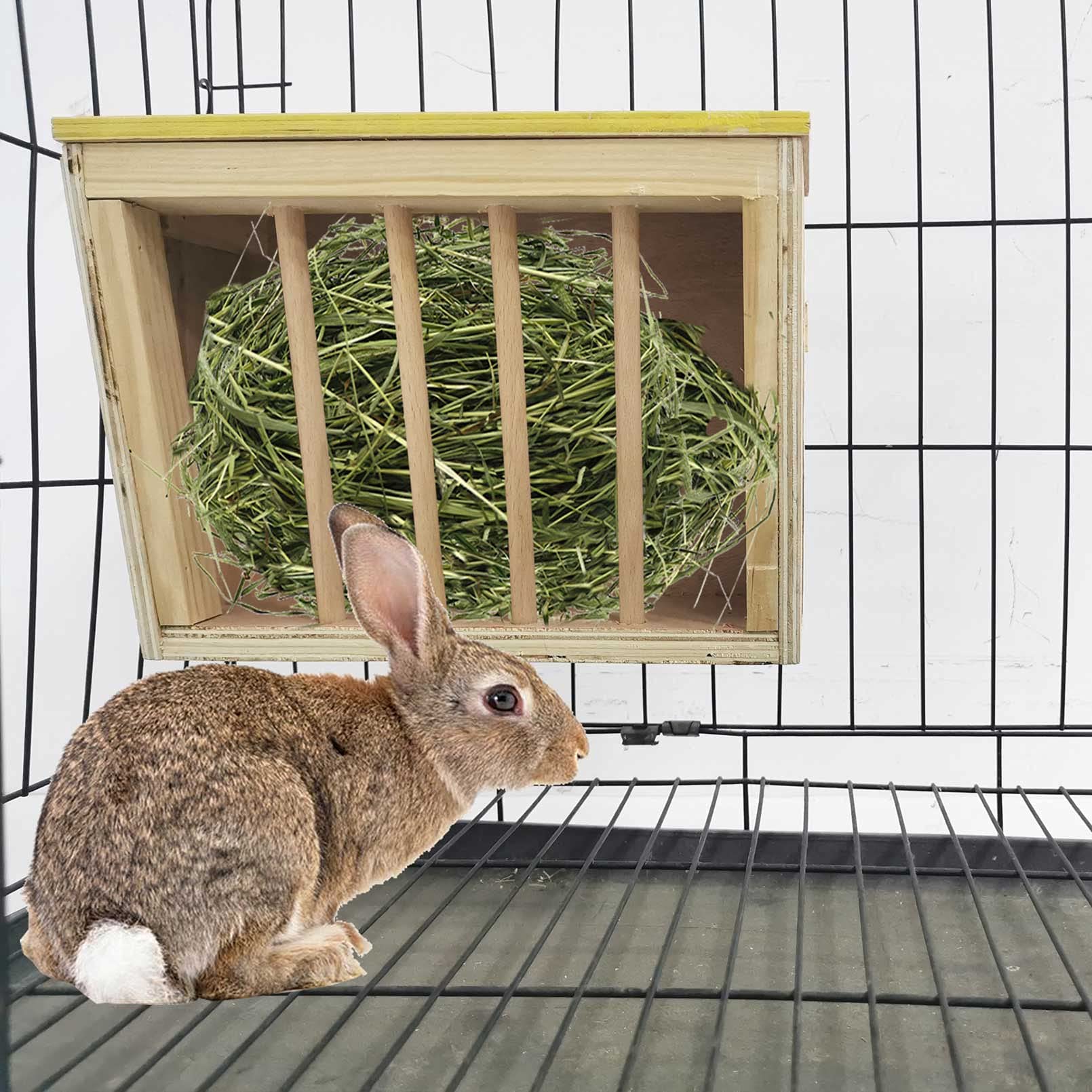 [EASY TO FILL HAY] The top of the rack has a lid that can be opened for adding hay and food. The lid also keeps the hay from being damaged and prevents small animals from getting injured by jumping into the hay trough.The wooden lid also works as a exploration deck for your rodents, such as rabbits, guinea pigs, and chinchillas