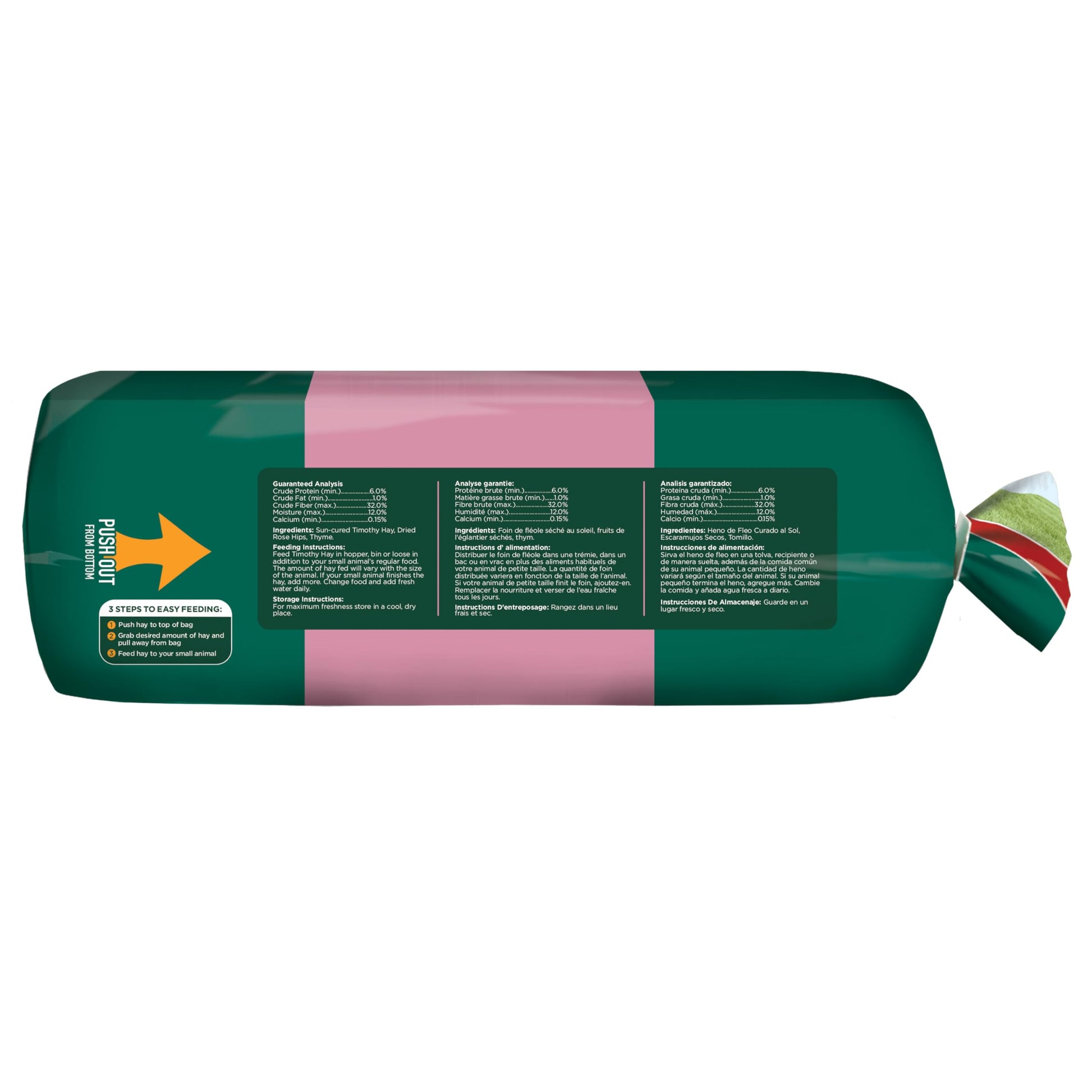 • Long strand timothy hay with an aromatic blend of whole rose hips and dried thyme for added enrichment