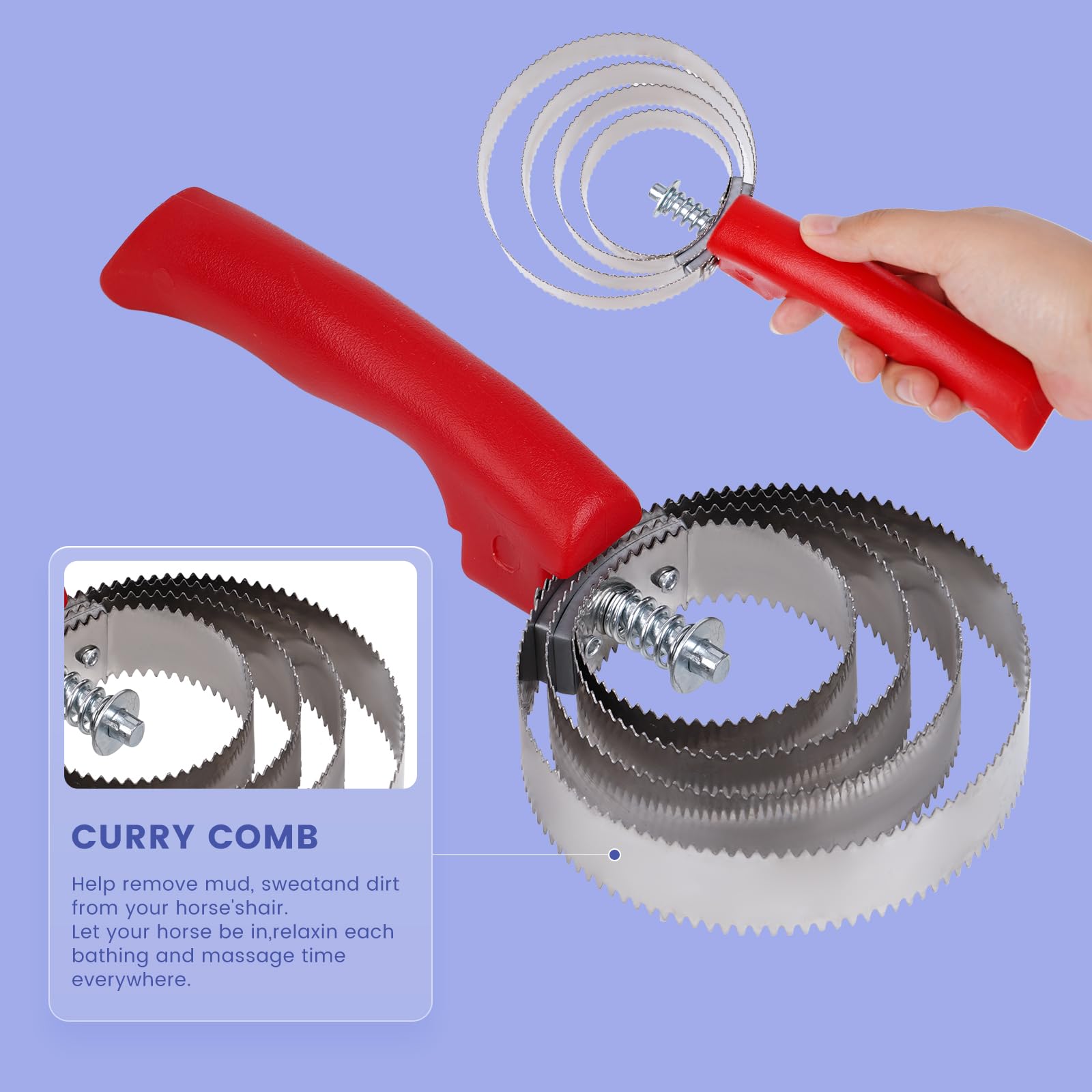Stainless Steel Curry Comb: Stainless Steel Curry Comb has two sides. The smooth side for daily use and the sharper side for tough mud and hair. It is not only suitable for horses, but also for cows, sheep, pigs, and dogs.