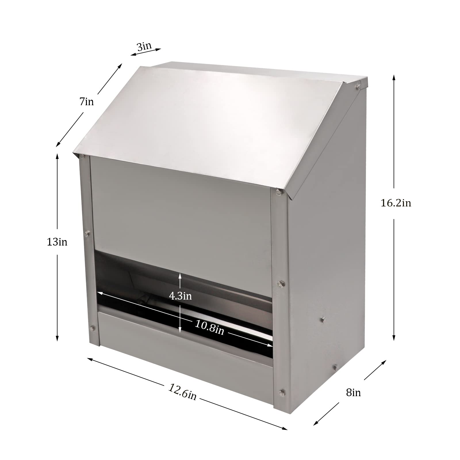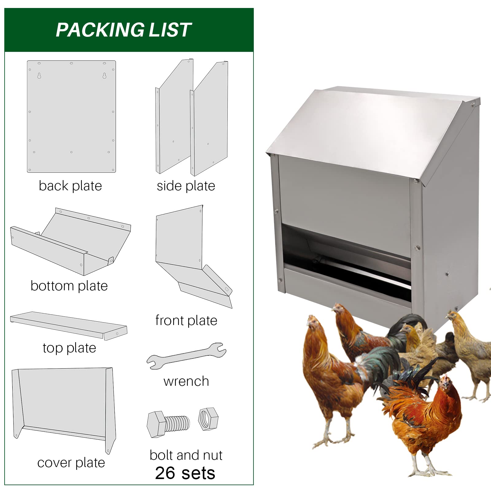 Size: 16.2"H x 12.6"L x 8"W. It can hold 25 pounds of feed and is suitable for various poultry. This poultry feeder has no assembly requirements, saving you the trouble of assembly procedures and making it more convenient to use.