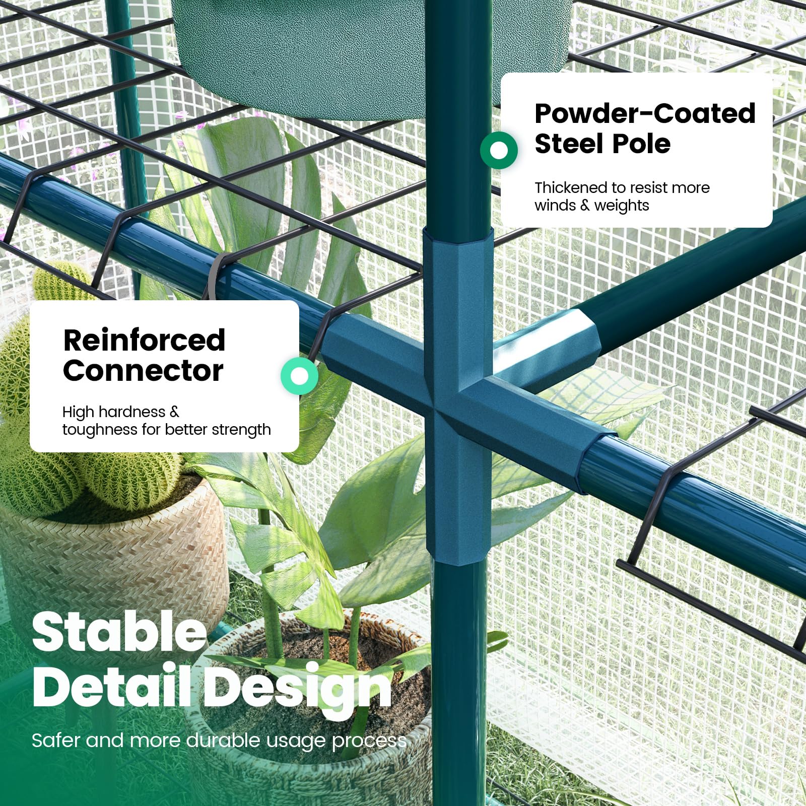 [Upgraded Cover Material]--Reinforced 145g/㎡ (Others: 135g/㎡) green PE grid cover which is added 6% Anti-UV inhibitor, makes longer greenhouse service life possible. No worries - all safe eco-friendly materials are selected to make your plants all good.
