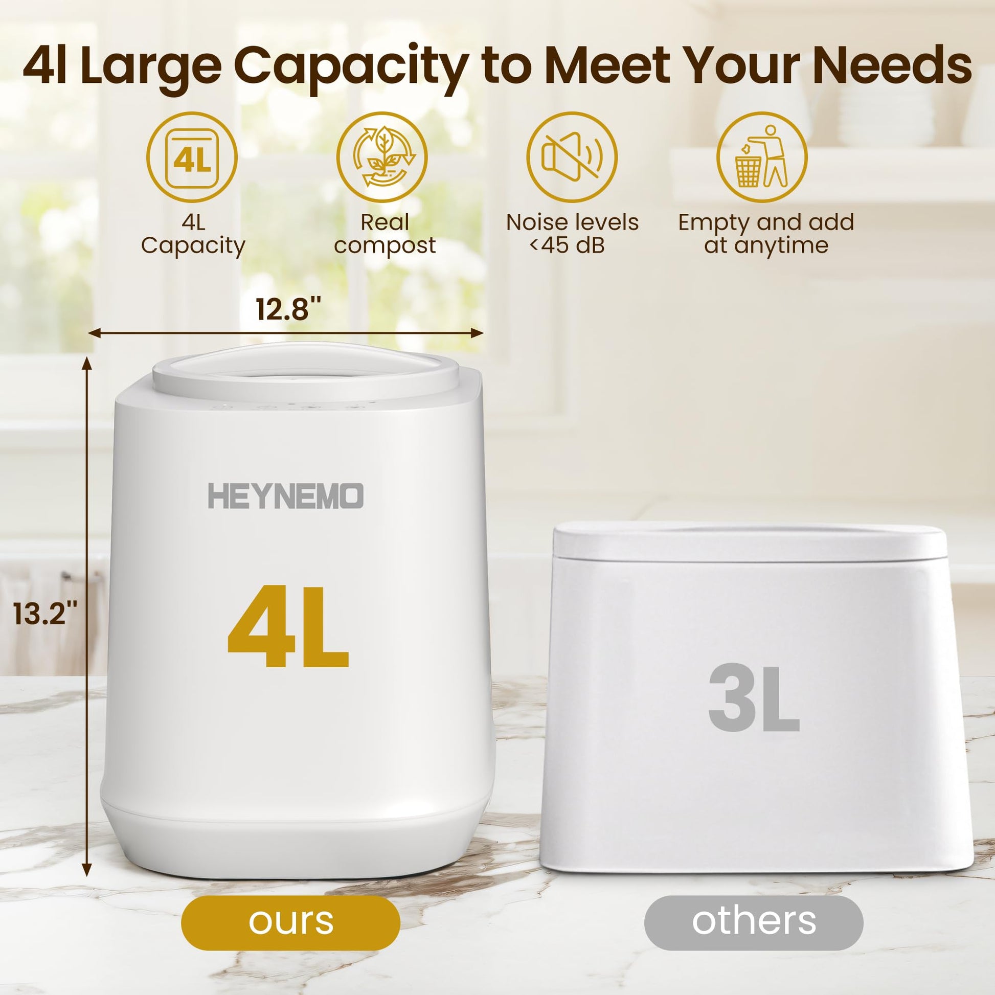 Kiss the Water Electric Composter for Kitchen, 4L Large Smart Countertop Compost Bin with 3 Composting Modes, Odorless Indoor Electric Kitchen Food Recycler with Safe Lock, White