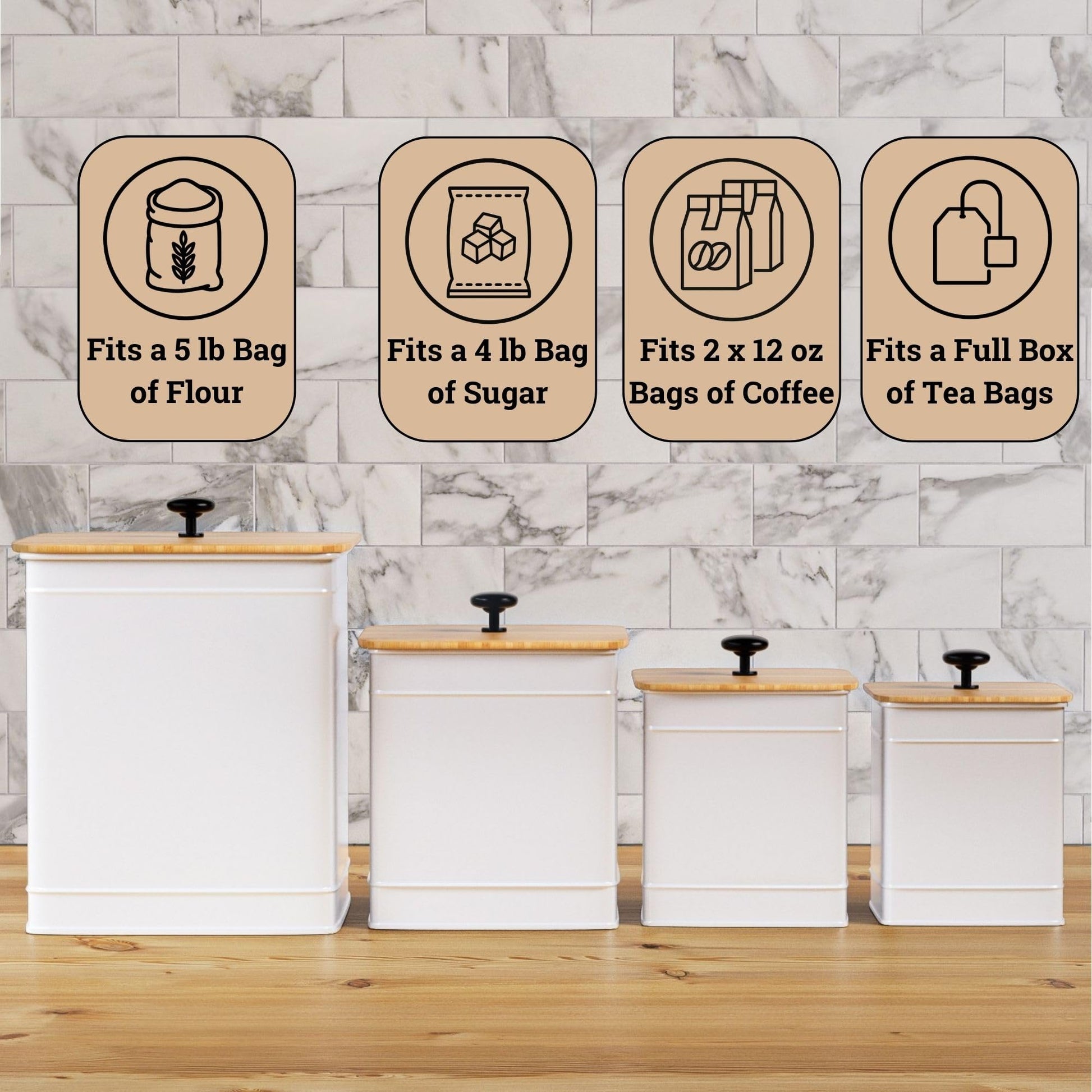 DECORATIVE & FUNCTIONAL - Designed for display with a sleek matte white powder coated finish and contrasting bamboo lids, these decorative kitchen jars match any decor from farmhouse to modern. Made of iron, these white kitchen accessories are light and not breakable, but sturdy and designed to last, as well as being easy to hand wash.