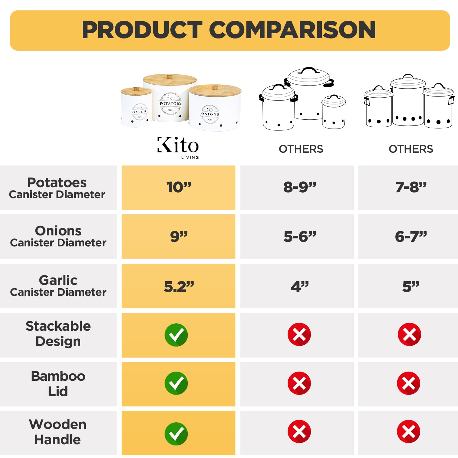 SPACIOUS AND STACKABLE: Our pantry storage containers offer more space and use a unique stacking design to help you store more while taking up less space on your counters. Each pack comes with a potato canister (10 x 7.1 inch / approx. 8 to 9 lbs), onion canister (9 x 6.2 inch / approx. 5 to 6 lbs), and garlic canister (5.2 x 5.9 inch / approx. 1.5 to 2 lbs)