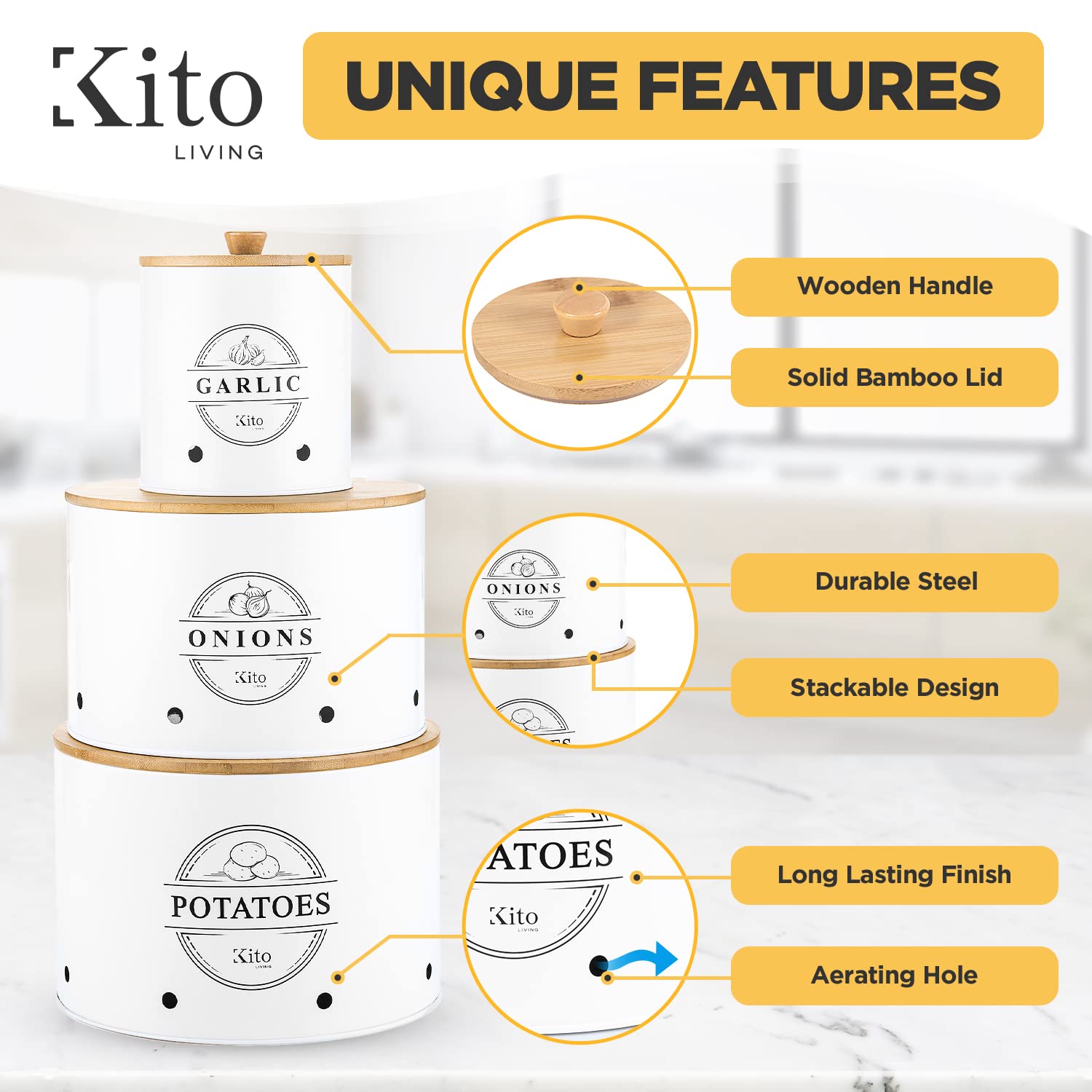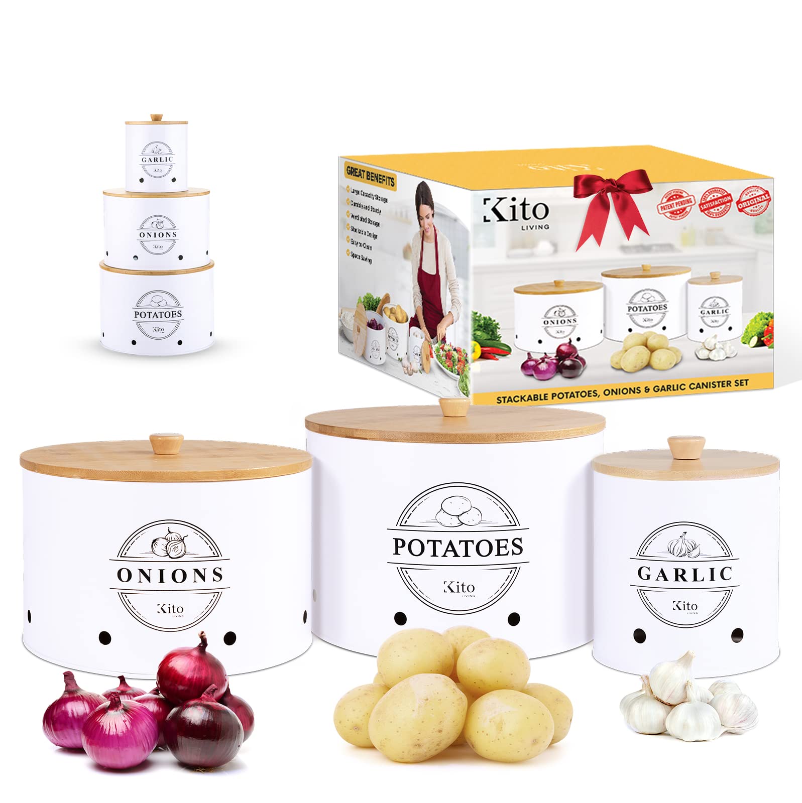 Kito LIVING Canister Sets for Kitchen Counter with Wooden Bamboo Lids, Kitchen Canisters for Countertop, Stackable Steel Farmhouse Canisters for Potato Storage, Onion and Potato Storage Bins - White