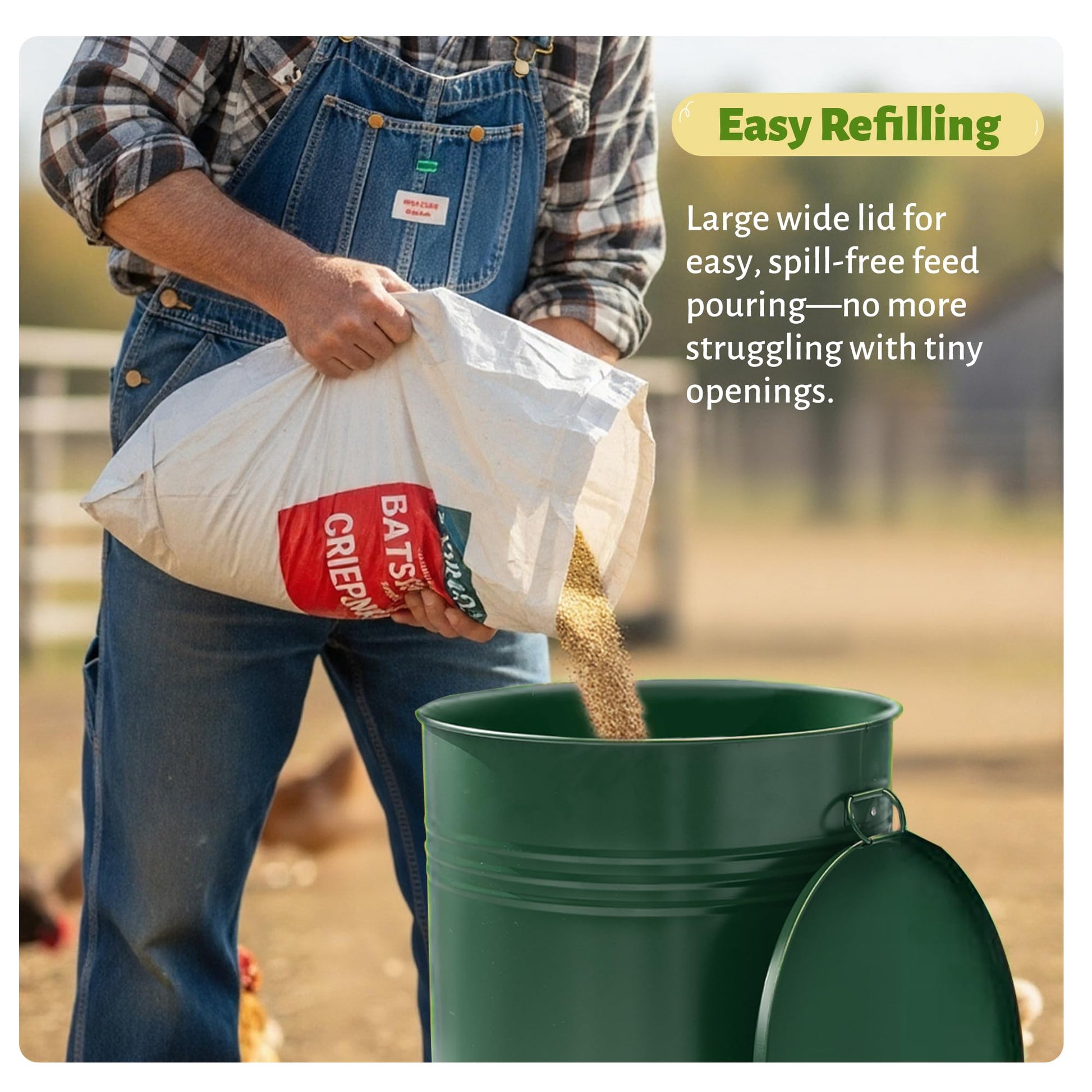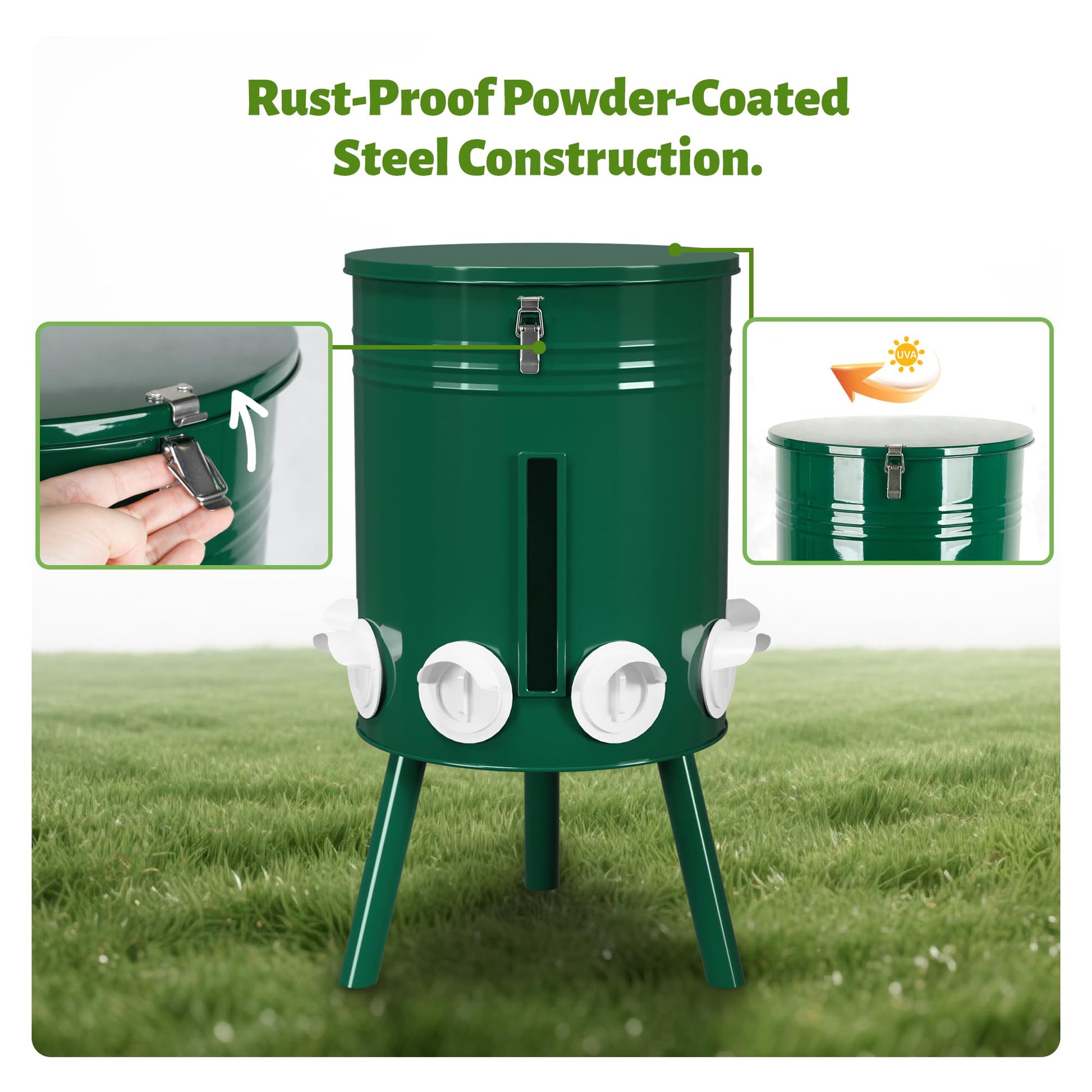 Rust-Proof Metal Construction: Built with powder-coated steel construction, this chicken feeder resists rust and corrosion for lasting outdoor durability. The sturdy metal build withstands daily coop activity without damage.