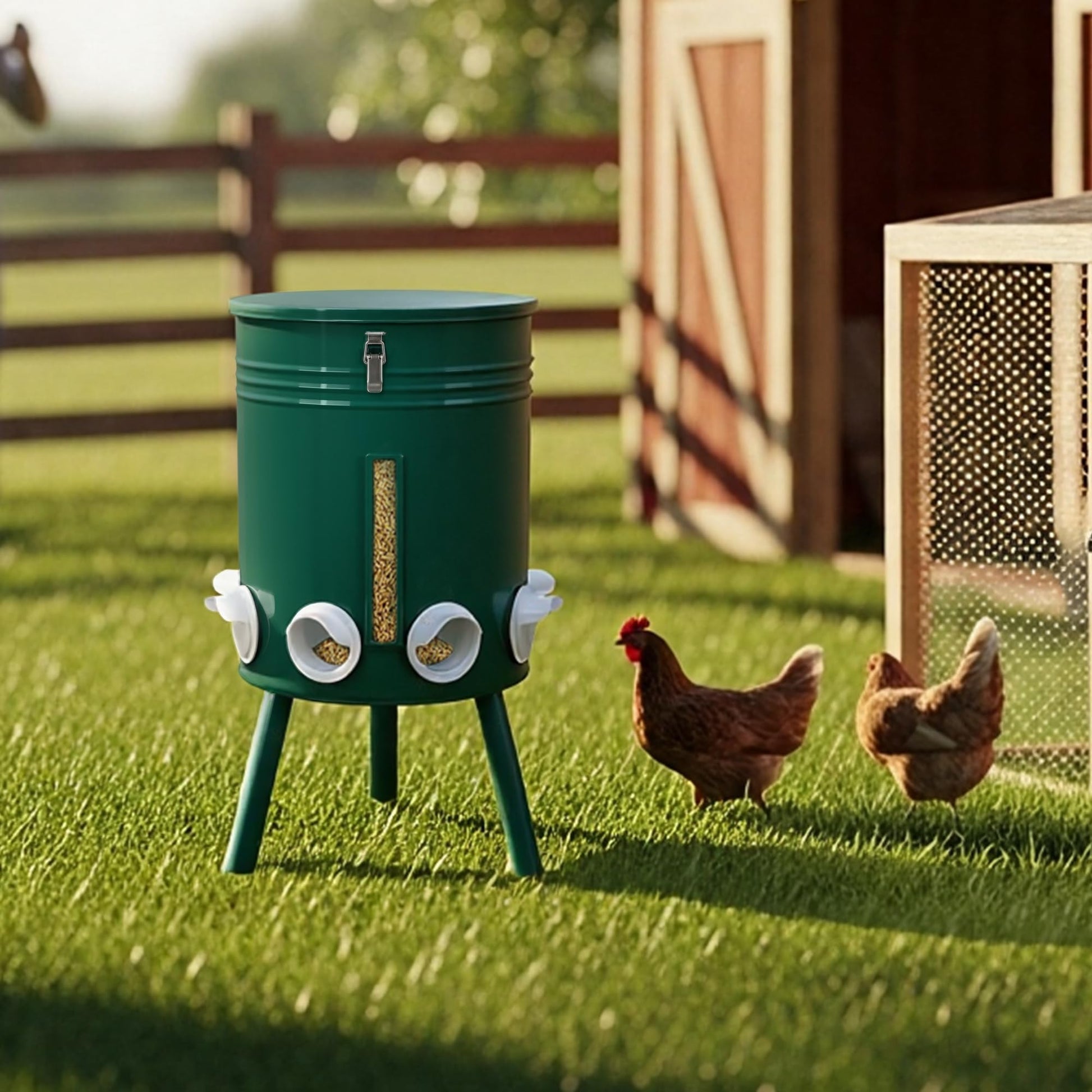 Barrel Hygiene & Quick Setup: The smooth cylindrical chicken feeder design enables effortless cleaning with no corners for grime buildup. Tool-free assembly takes under 30 minutes for one person using pre-drilled hardware.