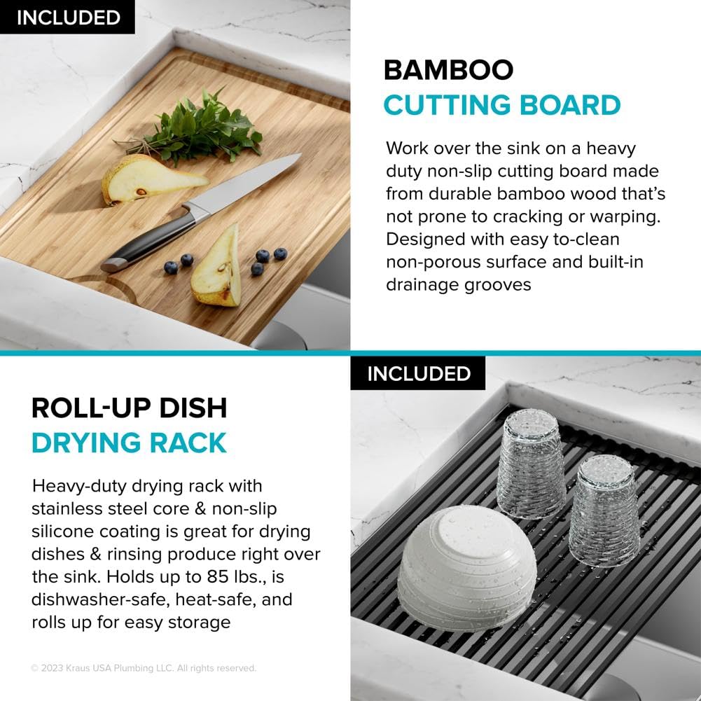 WORKSTATION SINK with integrated ledge for sliding accessories allows you to work right over the sink while minimizing clutter on the kitchen counter – Chop and slice on the durable bamboo cutting board or dry dishes on the heavy-duty rolling mat