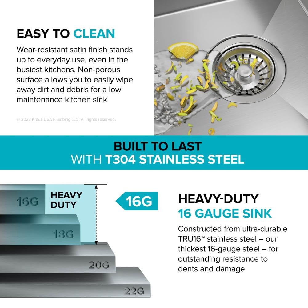 HEAVY-DUTY 16 GAUGE SINK: Designed for lasting durability, high-performance TRU16 gauge stainless steel sink stands up to everyday use with great resistance to corrosion, dents, and damage