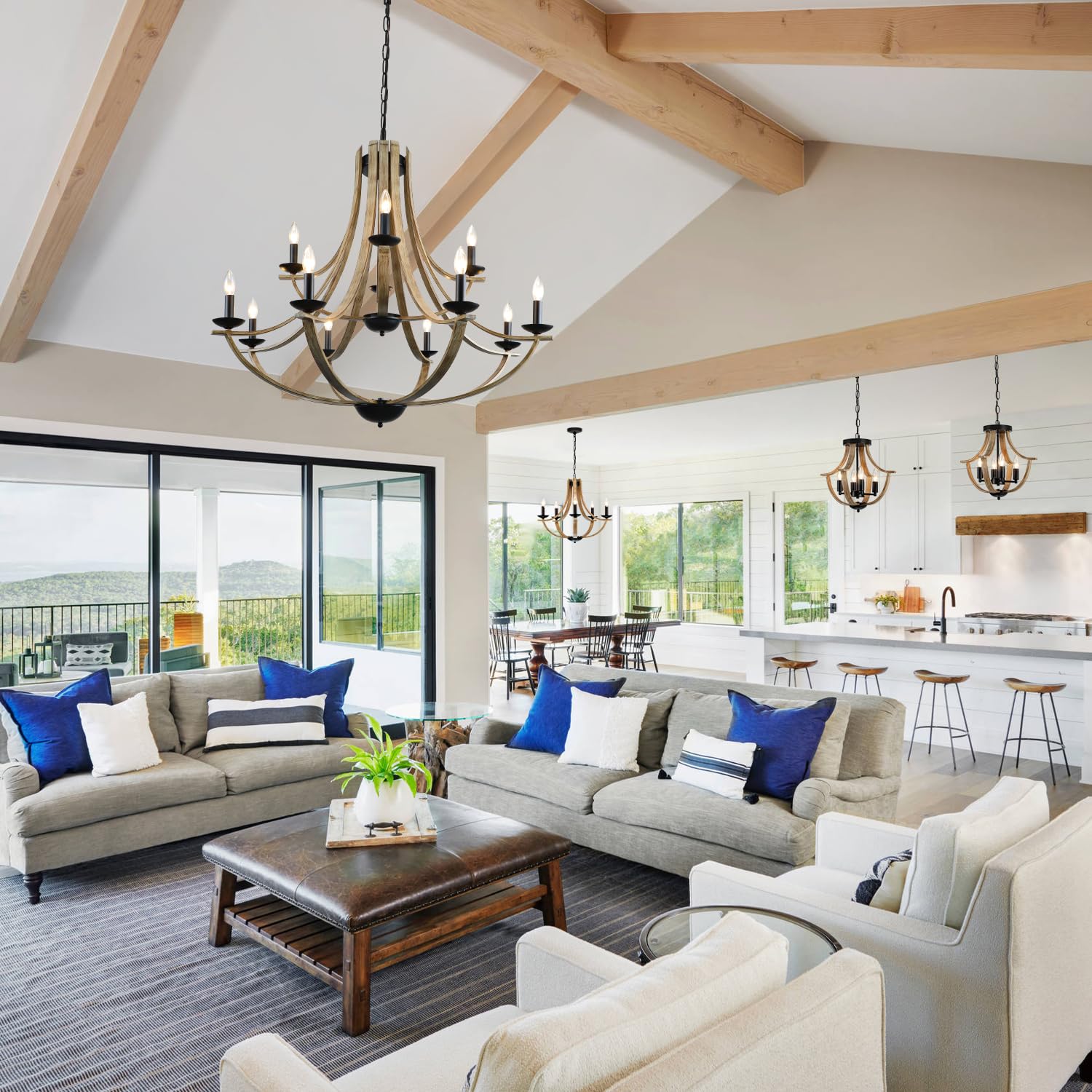 【Height Adjustable】This candle chandeliers for living room has an adjustable 79”iron chain, you can adjust the hanging height as your need. The width from arm to arm is 41", the height of the light is 35", and the overall height of the light is a minimum of 35" and a maximum of 130". Modern farmhouse chandelier could work on all ceilings including flat, slanted, vaulted or sloped ceiling.