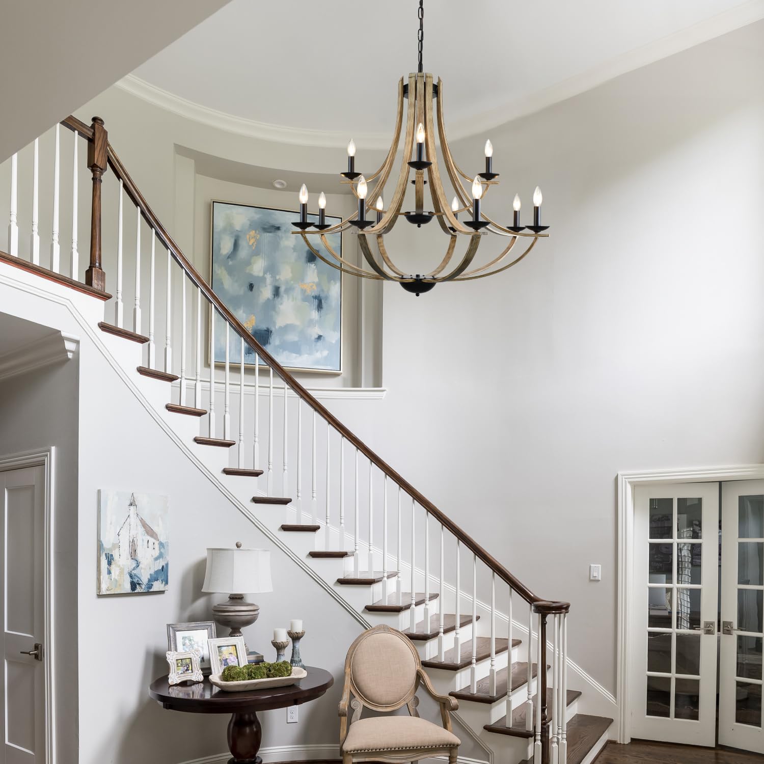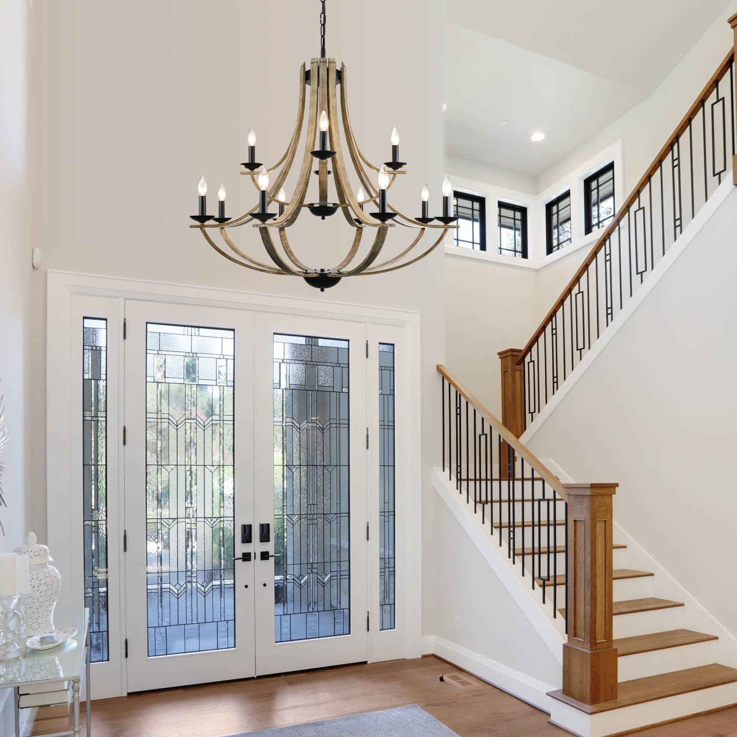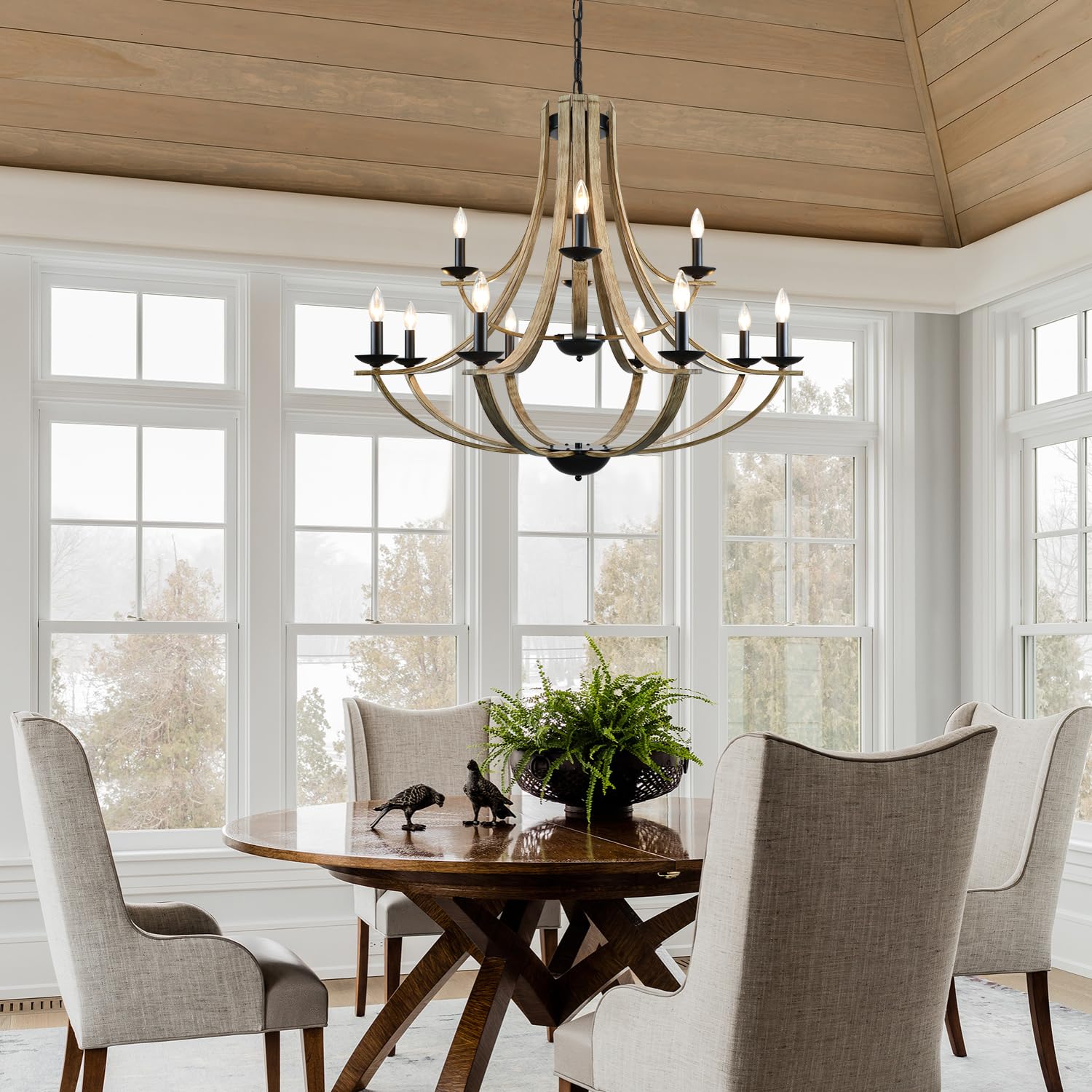 【Vintage Farmhouse Design】The 2 Tier 12-lights Farmhouse chandeliers is crafted from metal features a hand-brushed Faux wood grain color. Simple profiled curve profile, Black+retro wood grain finish, so that this dining room chandelier is full of modern farmhouse. for dining rooms, living rooms, kitchen islands, entryways, hallways,
