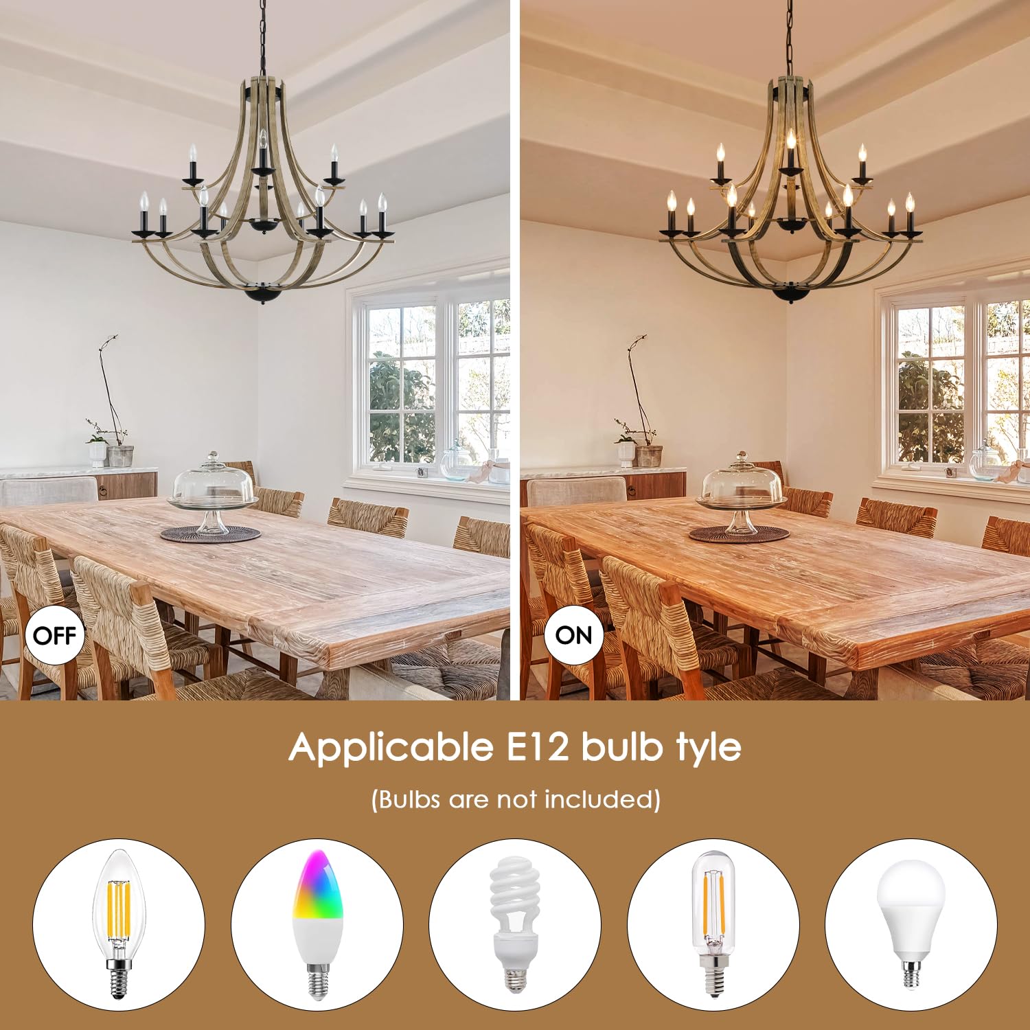 【E12 Base】The Farmhouse Style living rooms Pendant Light uses 12 40-watt E12 base bulbs (bulbs not included) and is compatible with LED, CFL, halogen, or incandescent lighting. It is compatible with dimmable bulbs and switches (bulbs and switches not included). The different lighting effects shown in the pictures depend on the bulb you use.
