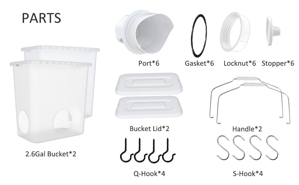 Efficent chicken feeder kit (WITHOUT WATERER COMPONENT) includes:2 PACK 16LB Feeder Bucket, 6 Chicken Feed Ports and hooks accessories; easy to hang on wire chicken fence or chicken coop wall