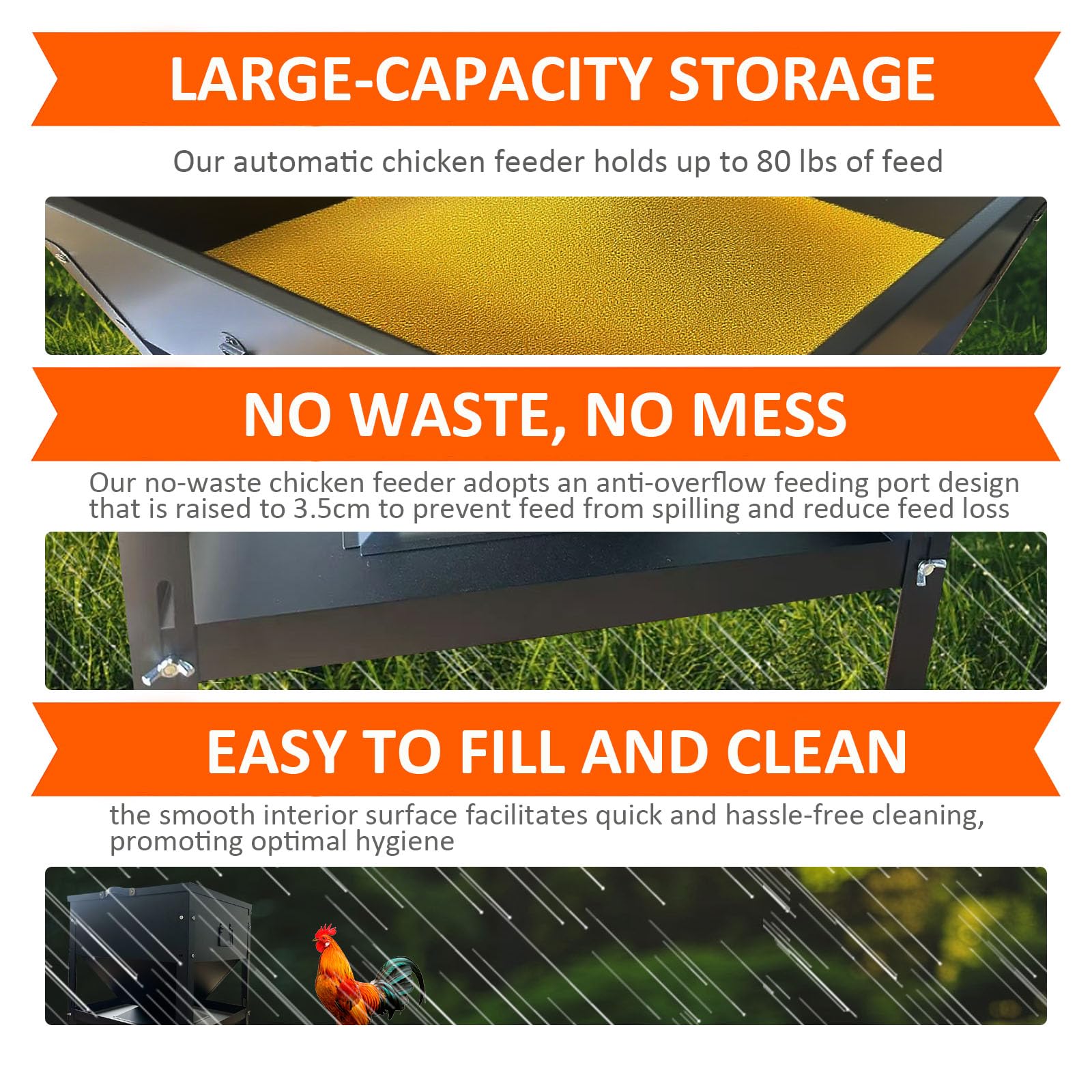 【Large-Capacity Storage】This automatic chicken feeder holds up to 80 lbs of feed, enough to nourish up to 16 chickens. Its large capacity reduces refill frequency, making it ideal for busy poultry owners.
