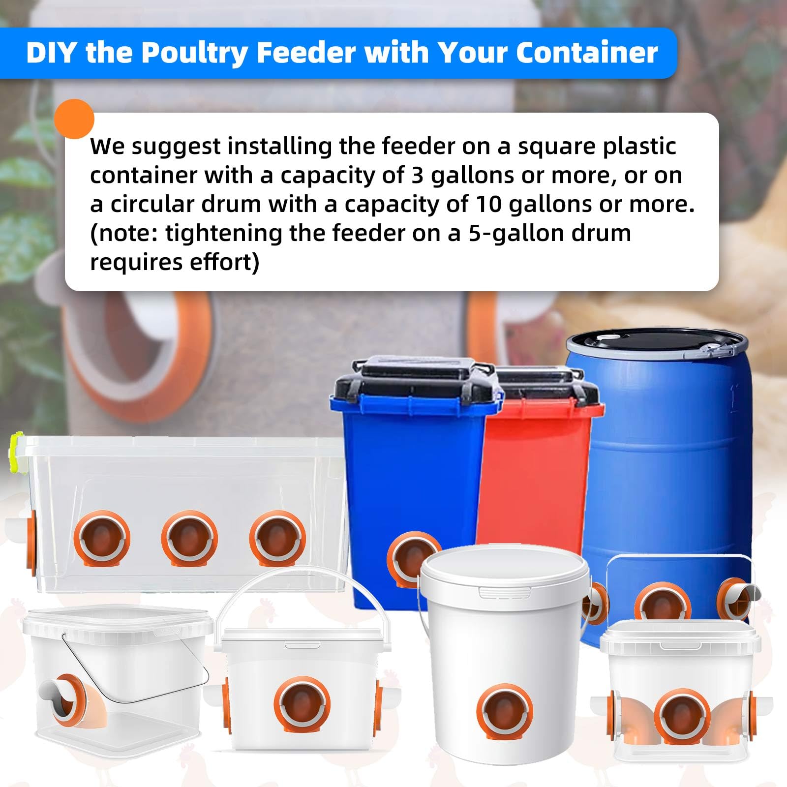 Large Chicken Feeder Port Make feeding time easier for you and your birds with our large DIY chicken feeders. Our chicken feeder can be easily installed on any container including buckets, bins, barrels, boxes, troughs, and so on. It has a 3.9" diameter that is much larger than most other DIY Chicken feeders on the market. This makes it Suitable for Bantam Chickens, Turkeys, Ducks, Roosters, and Other Poultry.