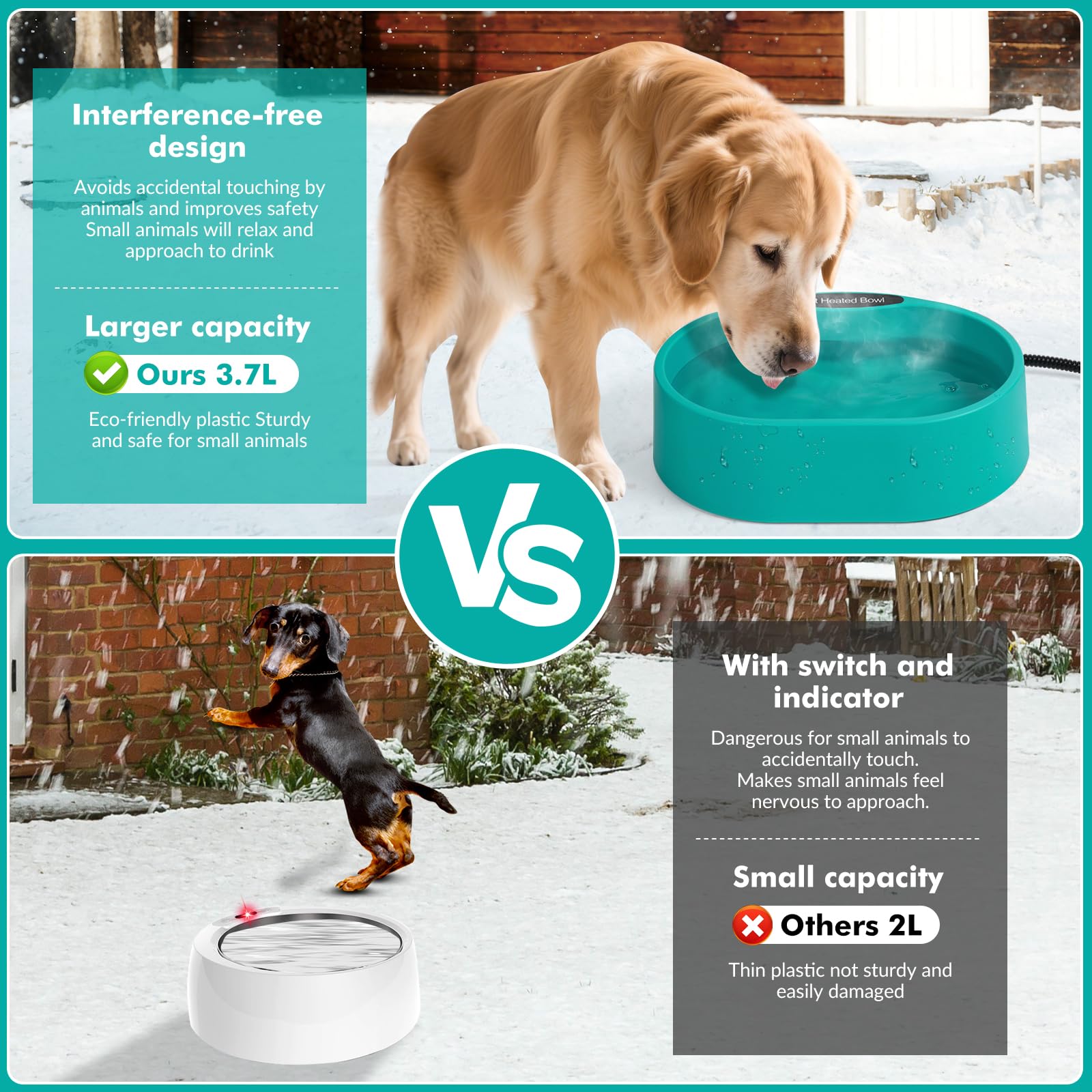 Suitable for Kinds of Pets: The Anti-freeze heated water bowl can be used outdoor in winter, and available for dog, cat, rabbit, chicken, duck, squirrel to provide drinkable water. We recommend placing it in a sheltered area to avoid wind damage, do not immerse the pet's thermal bowl in water, and unplug when there is no water in the bowl.
