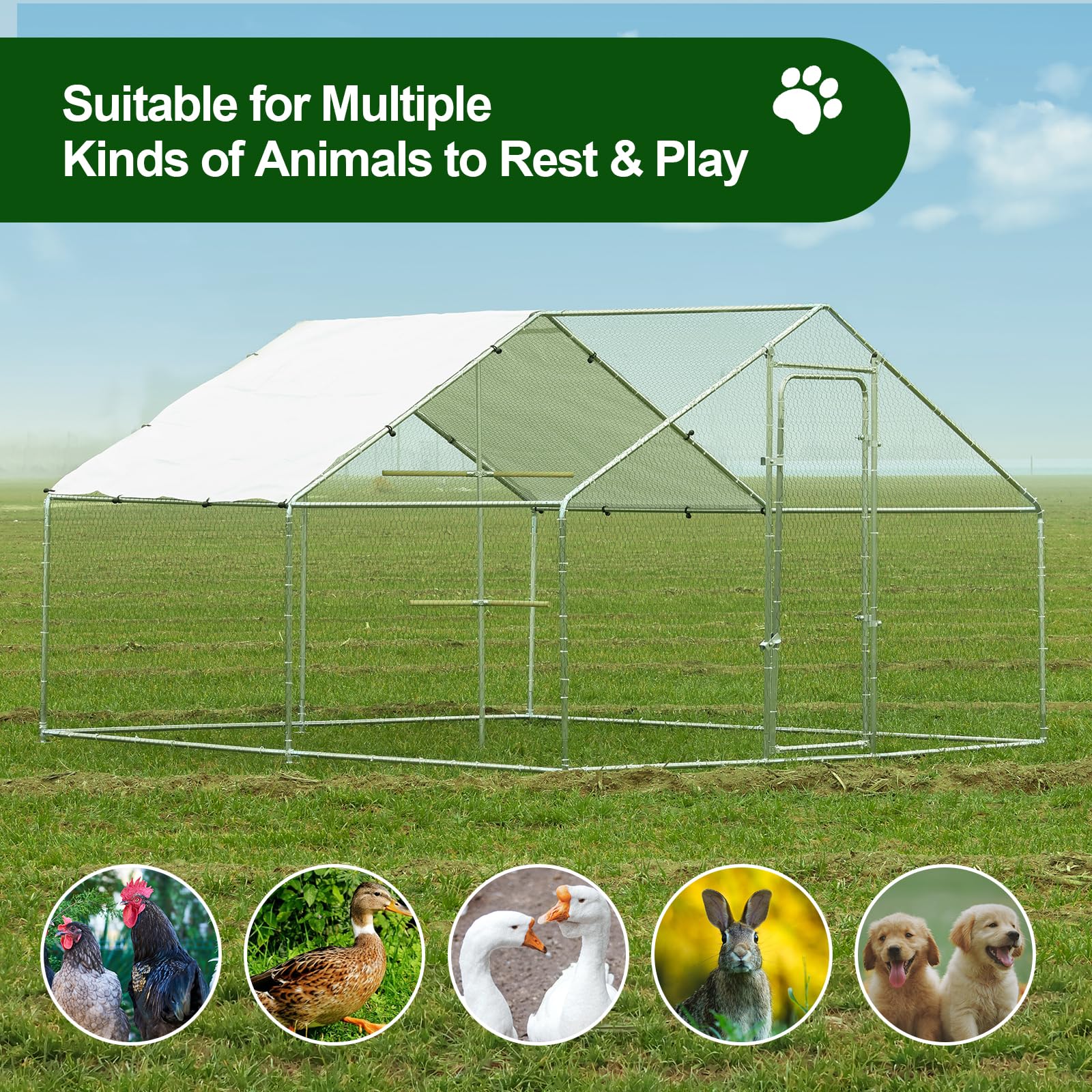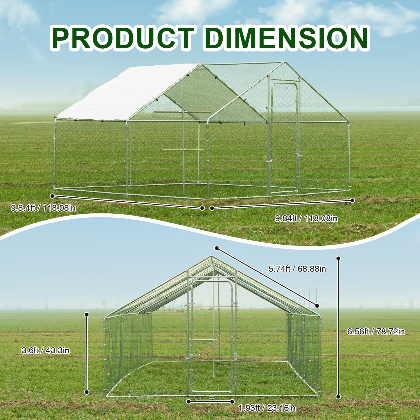 【Spacious Enclosed Chicken Coop】This metal chicken coop is specially designed for domestic animals to exercise and forage outdoors. Size is 117.6" L x 117.6" W x 78.72" H. Large metal chicken coop not only provides a large enough space for about chickens to play and rest, but also can be used as a habitat for small pets such as rabbits, ducks, cats, dogs, goats, birds, etc, as well as as a protective shelter for planting flowers, vegetables and fruits.