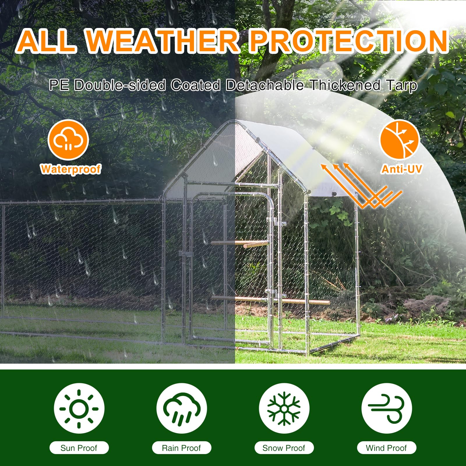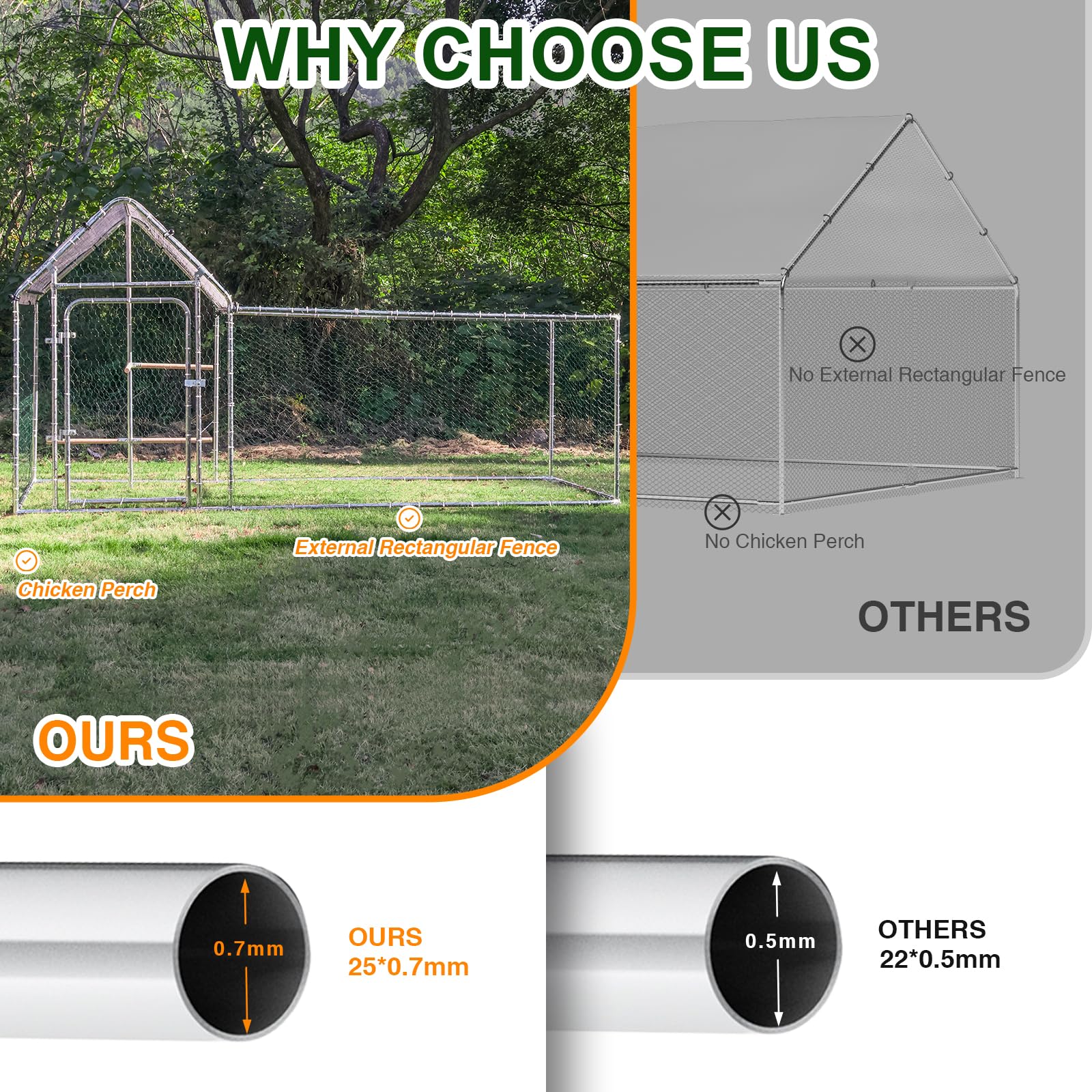 【Upgrade Rust-Proof & Durable Steel Structure】Chicken run is made of high quality galvanized frame and PVC protective mesh, so there is no need to worry about rust outdoors. Pipe thickness 0.7 mm, steel pipe diameter is thicker than most sold in the market, and can resist strong wind and rainfall, prolonging the service life of the coop. All frame corners on this chicken enclosure are well welded and ground to prevent sharp edges for safety.