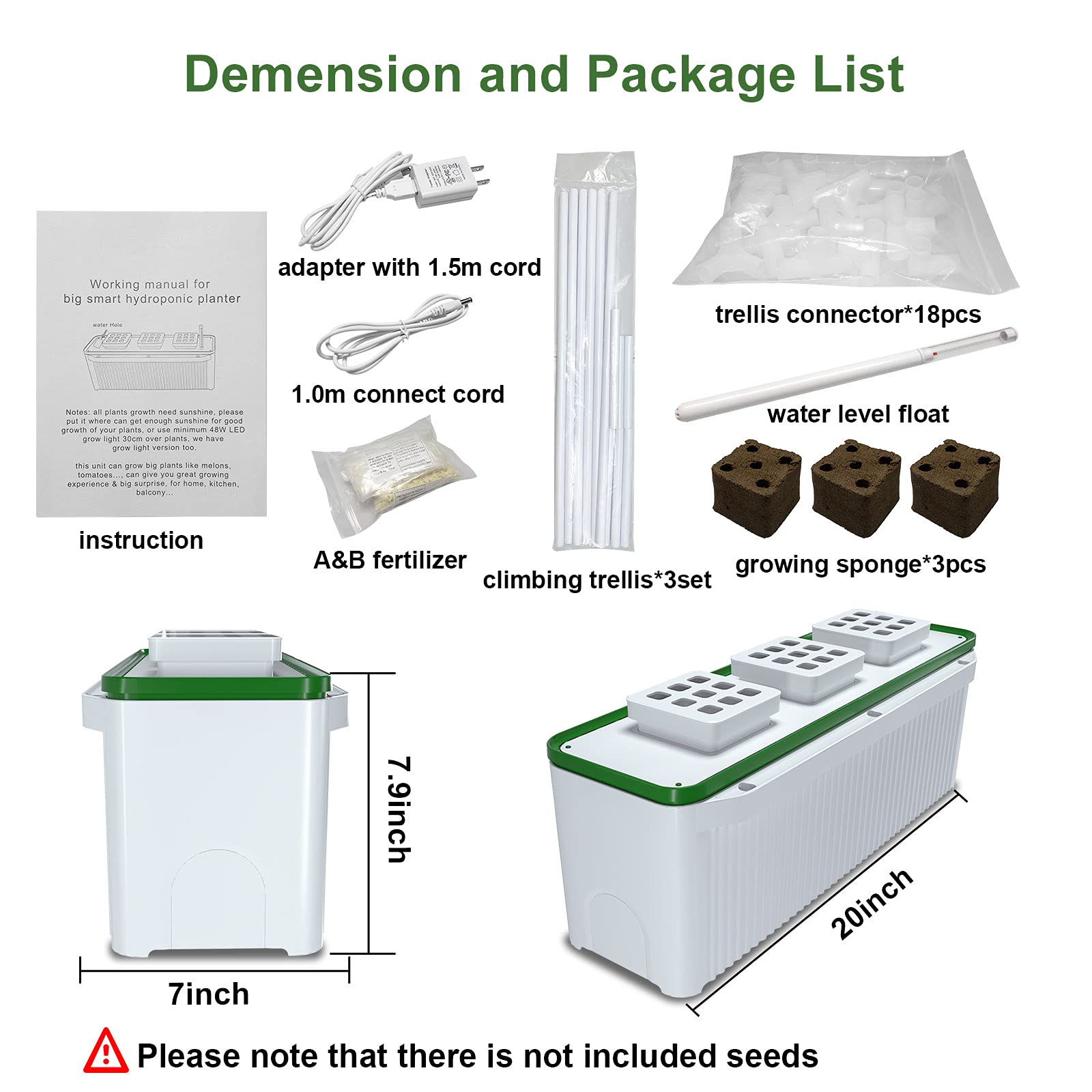 【Big&Extendable Height】Different from other small, crowded hydroponic grow kits which can only grow short height, the eSuperegrow 7L Growing System is a really indoor garden for a variety of plants and heights. Three big planter sections have enough space for vegetable and fruiting plants. Max 32 inch grow stand with 19.69inch trellis and assistant line, to support tall plants. Not only for herbs, cabbage, lettuce and spinach, but also for tomato, cucumber, eggplant, pepper, zucchini.