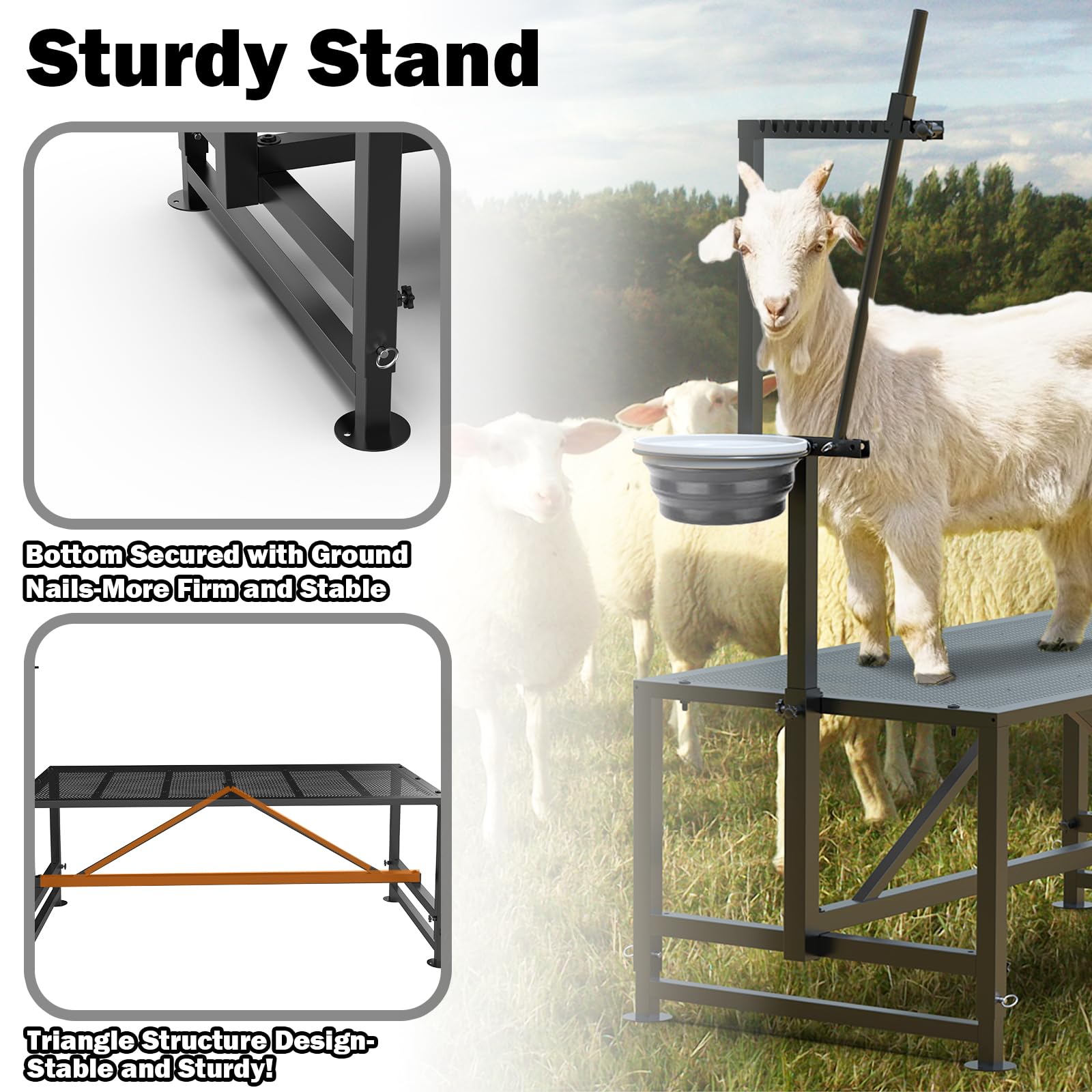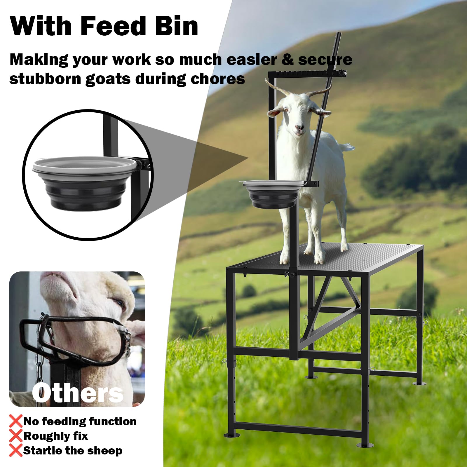 Goat Stand With Feeder- Goat milking stand with feed bin, making your work so much easier such as goat trimming/goat milking/giving your goats vacciness!Easier to secure stubborn goats during chores and make your goats can be secured for a safer, healthier herd.