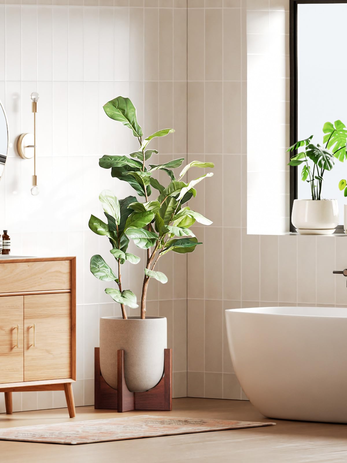 Premium Ceramic and Wood: Our 12 inch pot for plants is crafted from durable ceramic and paired with a sturdy acacia wood stand; The white exterior features a satin finish that complements the wood grain, creating a minimalist and elegant aesthetic; And the unglazed interior provides a suitable environment for optimal growth