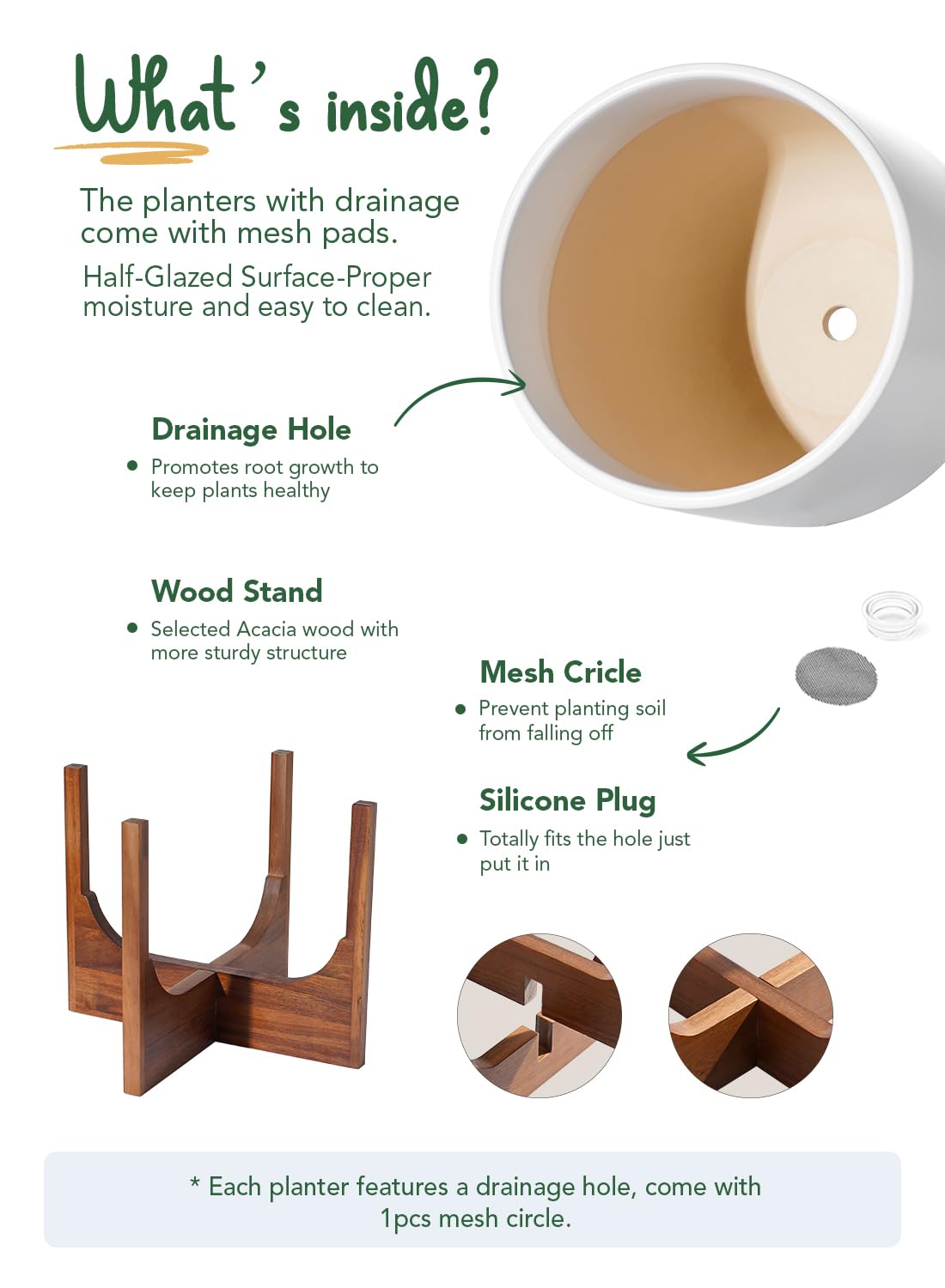 Complete Set: This planter with draiange hole includes a ceramic pot, wooden stand, drainage plug, and mesh pad, providing everything you need to create a thriving indoor garden