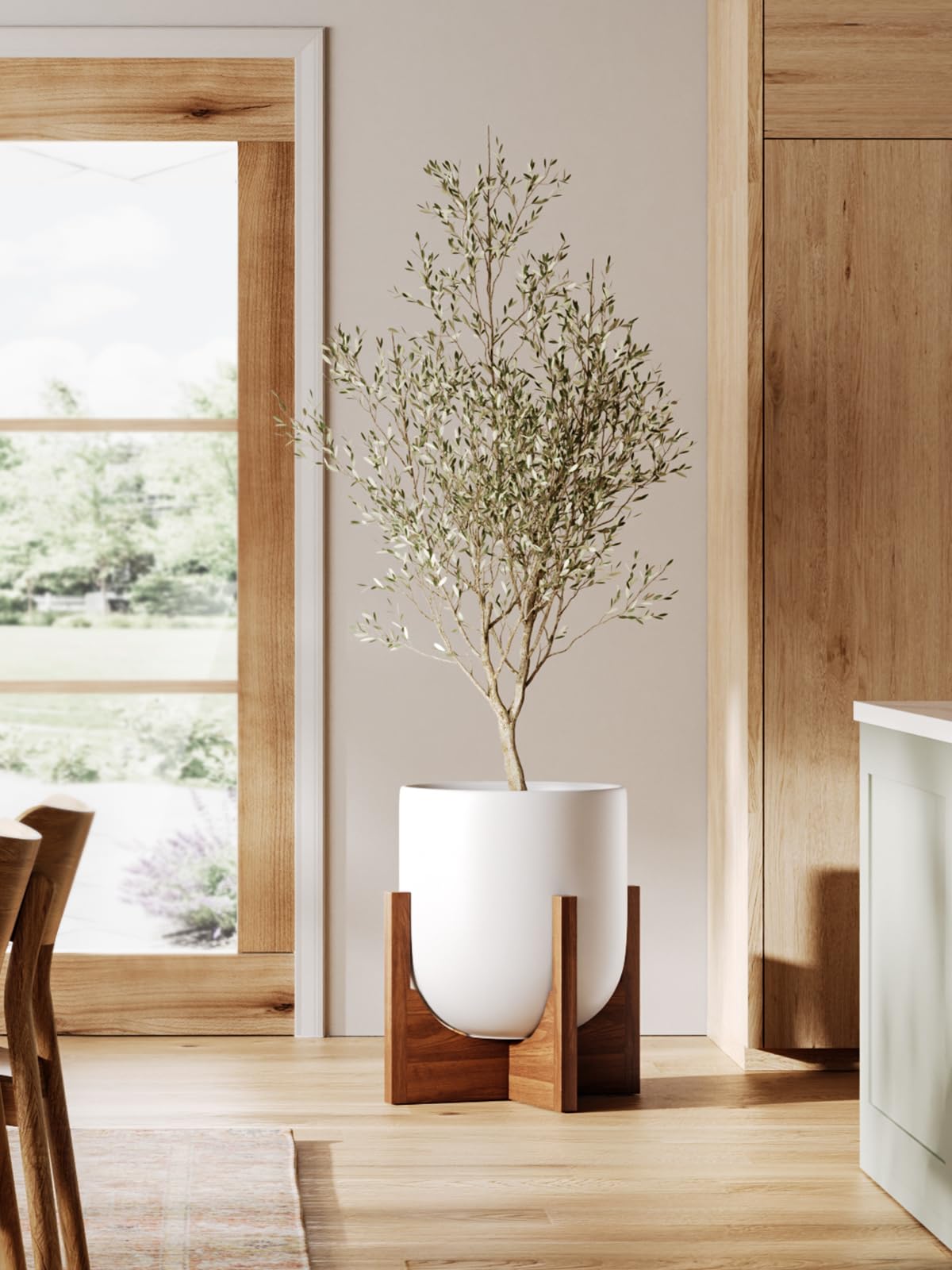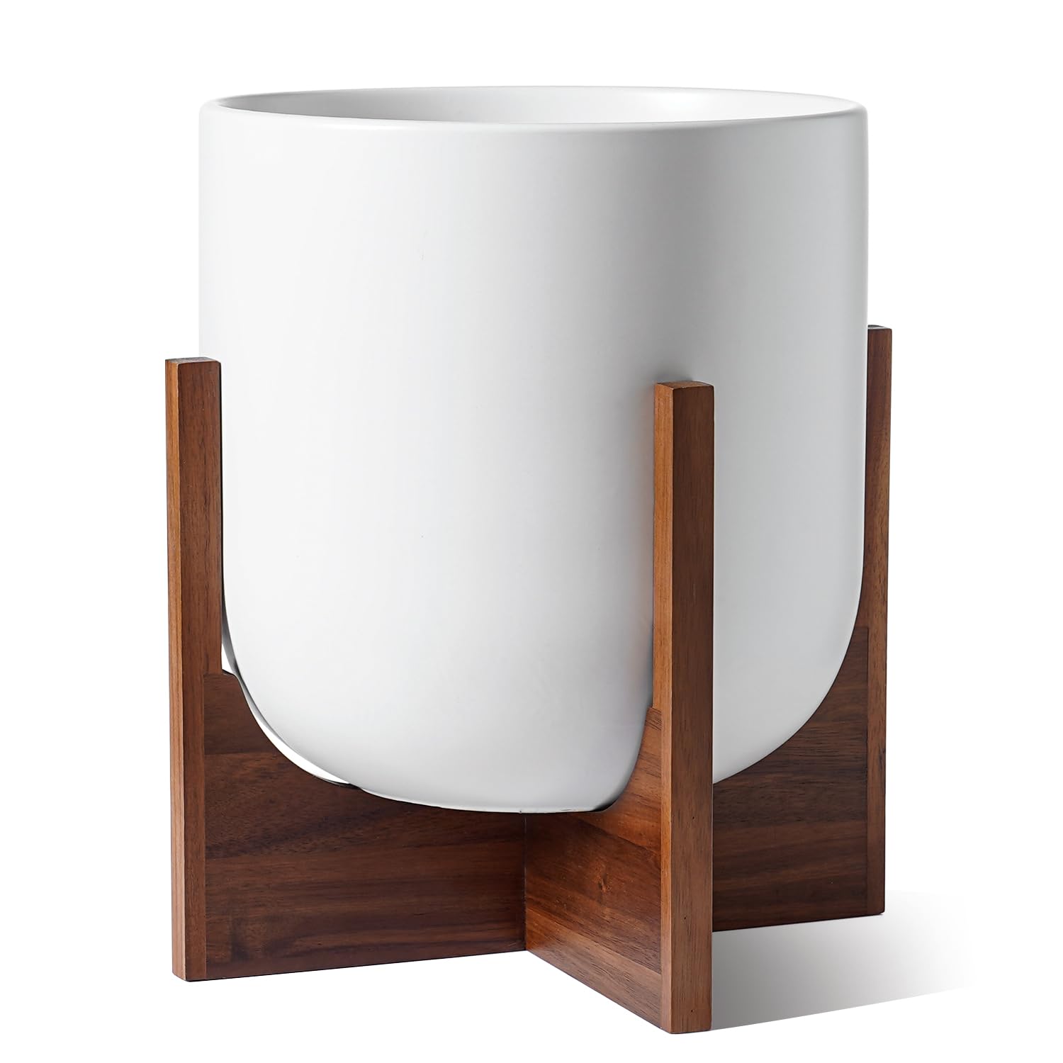 Premium Ceramic and Wood: Our 12 inch pot for plants is crafted from durable ceramic and paired with a sturdy acacia wood stand; The white exterior features a satin finish that complements the wood grain, creating a minimalist and elegant aesthetic; And the unglazed interior provides a suitable environment for optimal growth