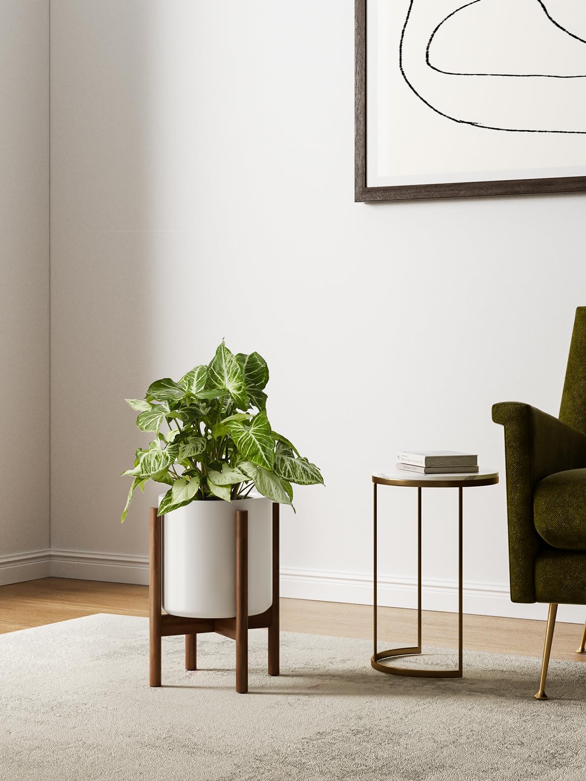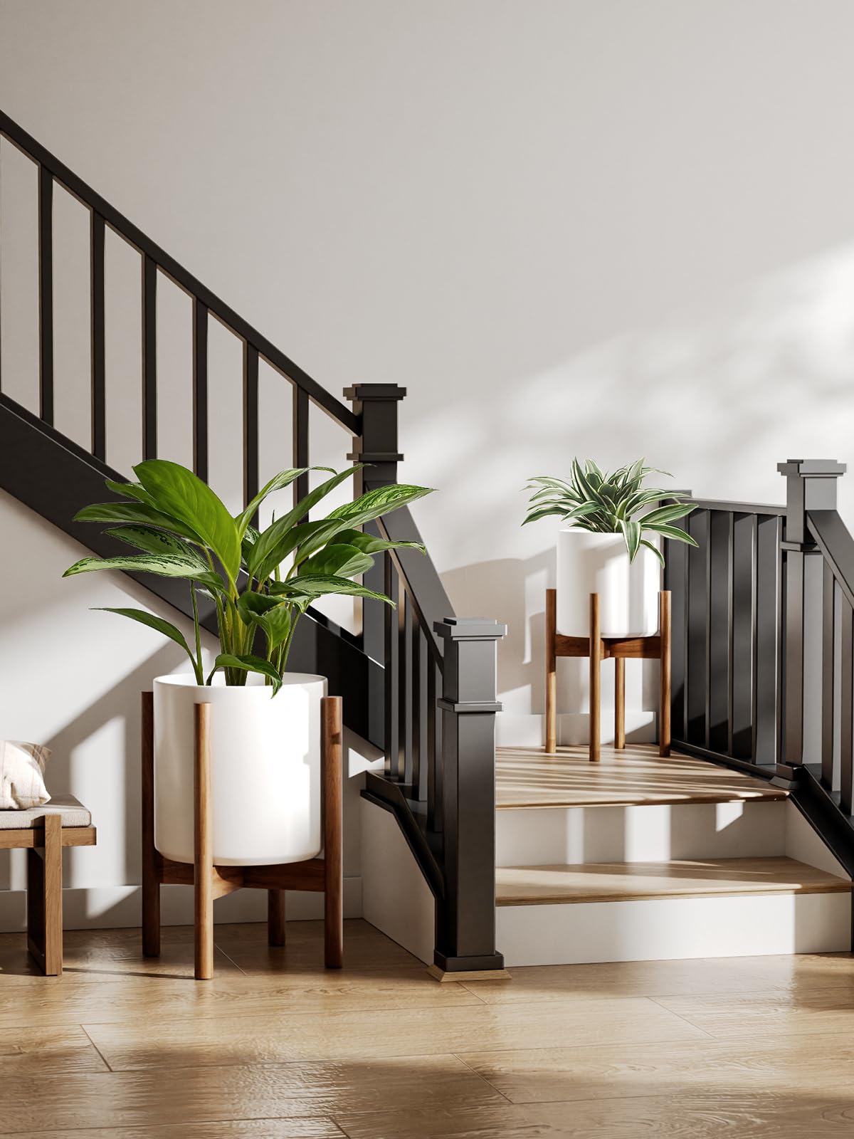 Stylish Design, Easy to Clean: This chic ceramic planter boasts a sleek modern aesthetic complemented by a mid-century wood stand, Its versatile design effortlessly blends with any decor, adding a touch of sophistication to your living room, stair corner, bedroom, or any desired area; Plus, maintaining is a breeze thanks to its smooth ceramic surface — wipe with a soft damp cloth to keep your planter looking fresh and vibrant