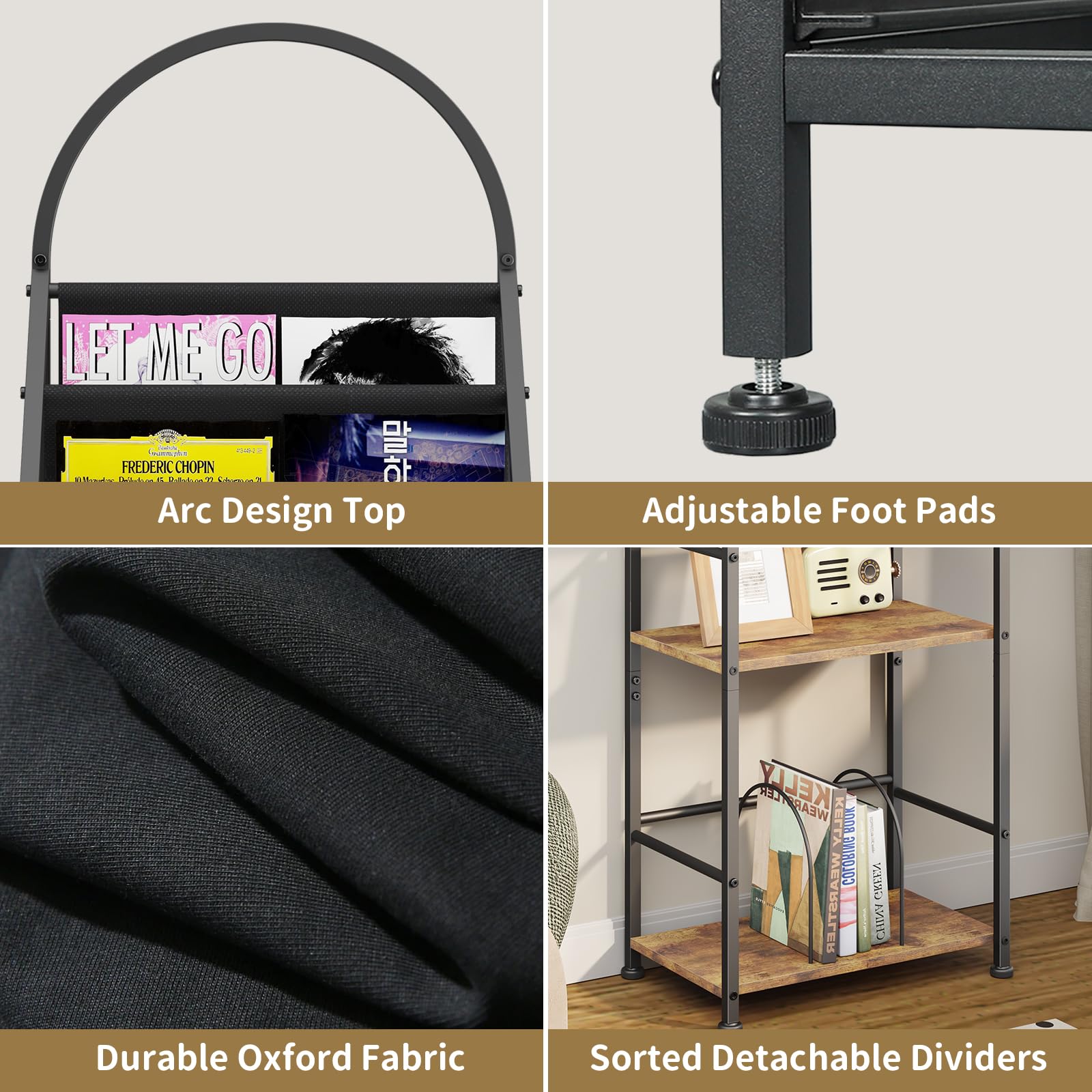 Premium Materials: Made of tough wood board, durable Oxford fabric, and metal frames. The standing bookcase is durable and flexible to hold the books and records sturdily and protects the vinyl from damage by squeezing against each other. Weight capacity: 300 lbs