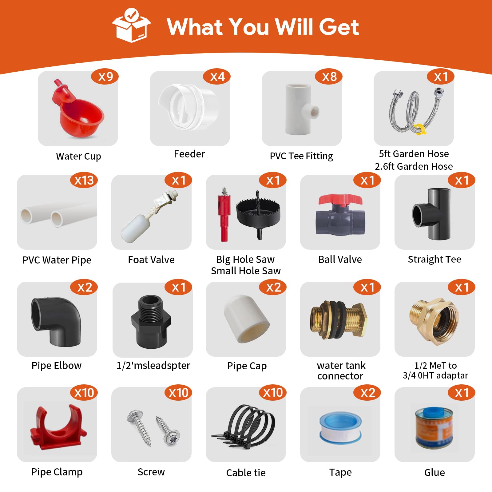 【Complete PVC Pipelines Chicken Waterer Feed Set】This is a complete PVC pipelines automatic chicken waterer feed system.The chicken water feeder system includes chicken water cups,poultry feeder, float valves,stainless steel hoses,PVC pipe, mounting drill bits, glue, tape,pipe adapters, and all necessary pipe fittings.All you need is an extra bucket!