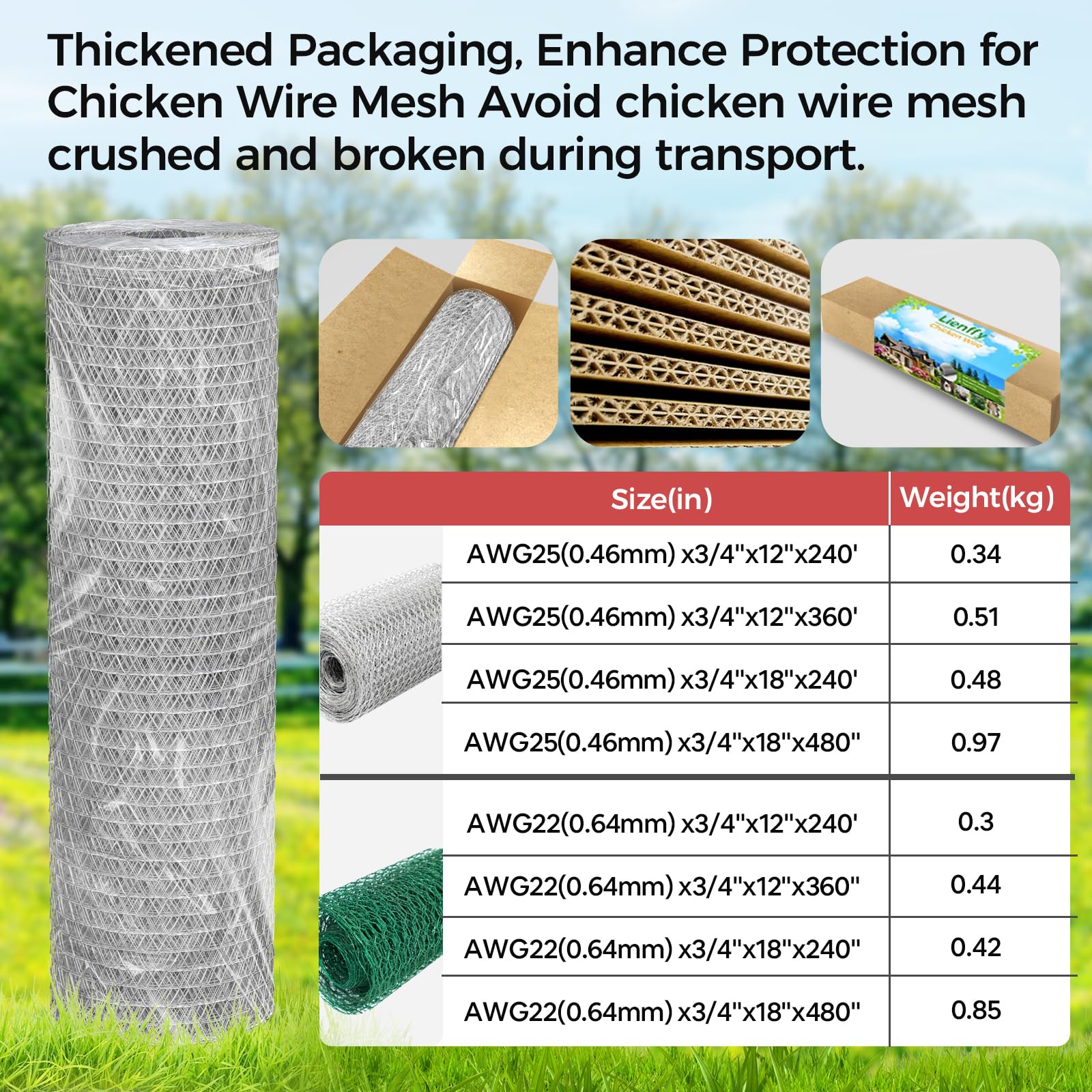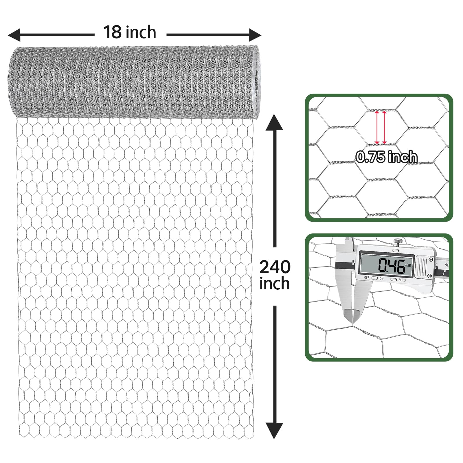 【Upgrade SIZE Chicken Wire】Each chicken wire has 18 '' × 240 '' ; Diameter: 0.46mm; Aperture: 0.75in. Wire fencing is long and wide enough to enable you to cut off any shape that you need.