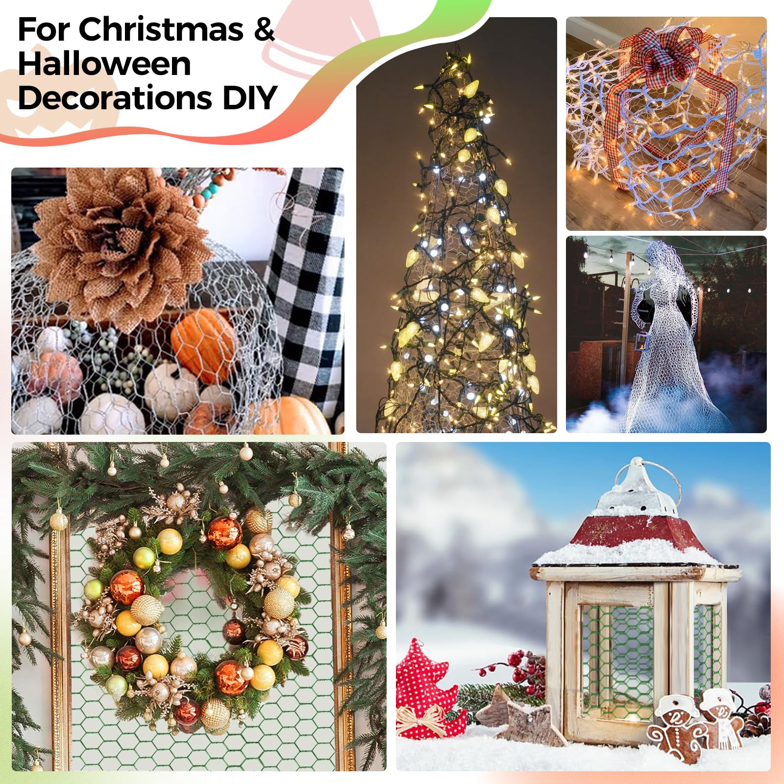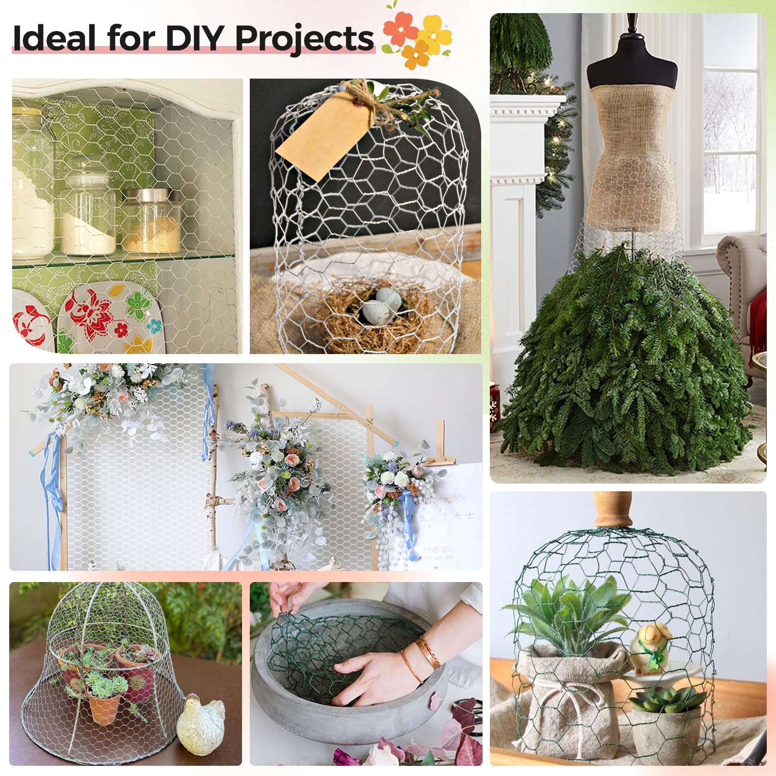 【Perfect for DIY Crafts】Perfect green chicken wire for floral arrangements for wedding. This galvanized chicken wire netting can create many home crafts, such as craft fruit baskets, pet cage safes, Christmas garland frame, photo walls, jewelry racks,trellis, earring holder, wall frame, pantry doors, Christmas tree, craft wire mesh, moss pole, cabinet door replacement, making animal models, any large projects, etc. Have fun and create your own DIY crafts with chicken wire fencing.