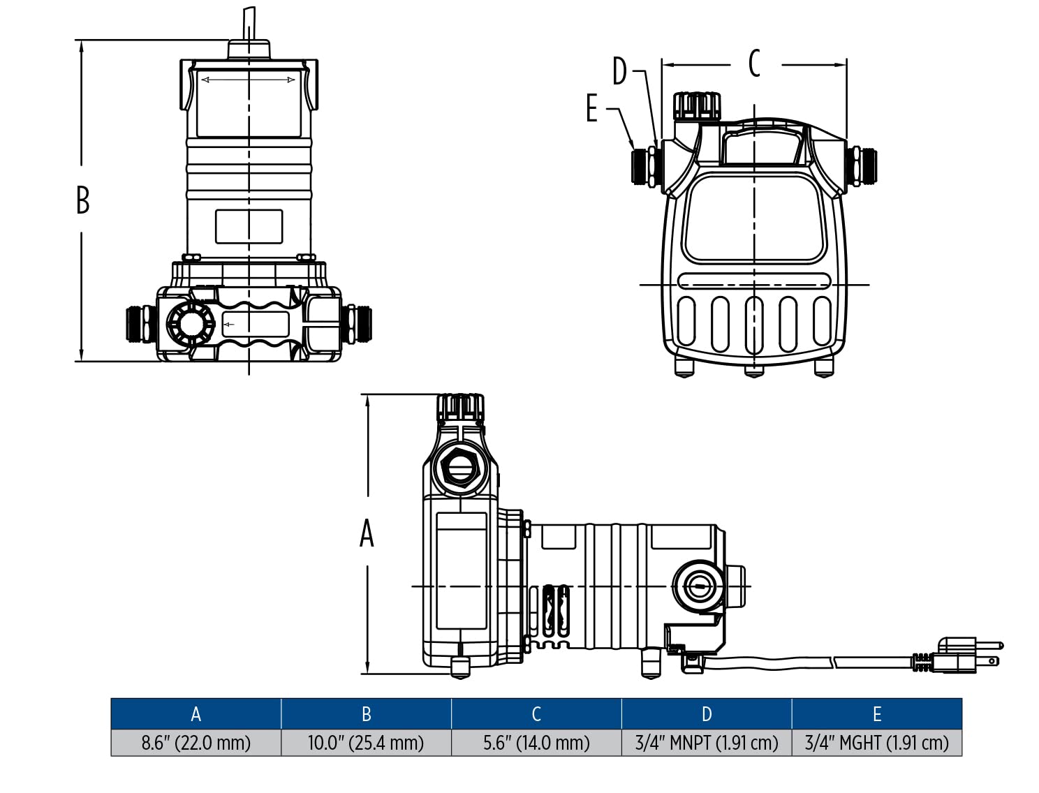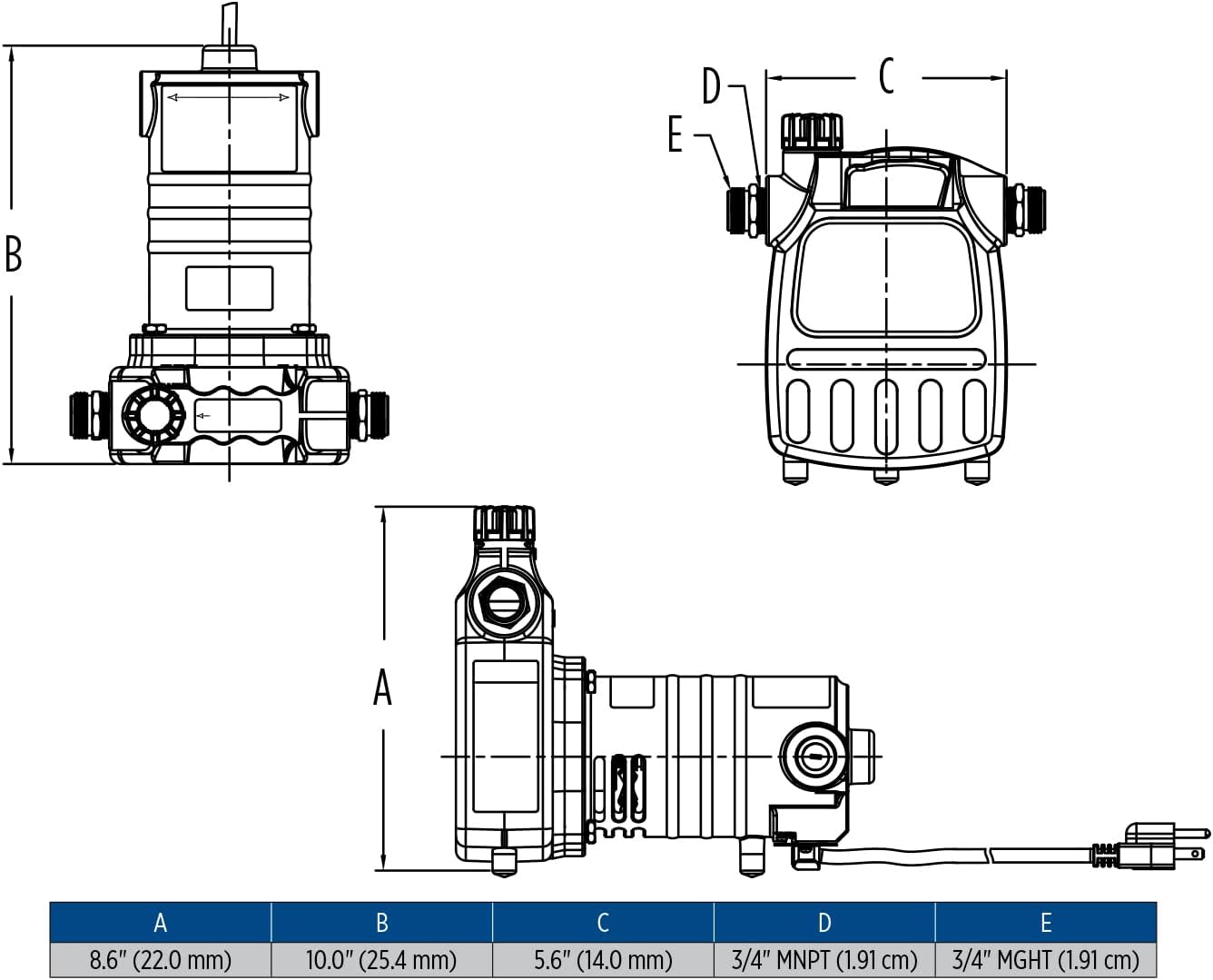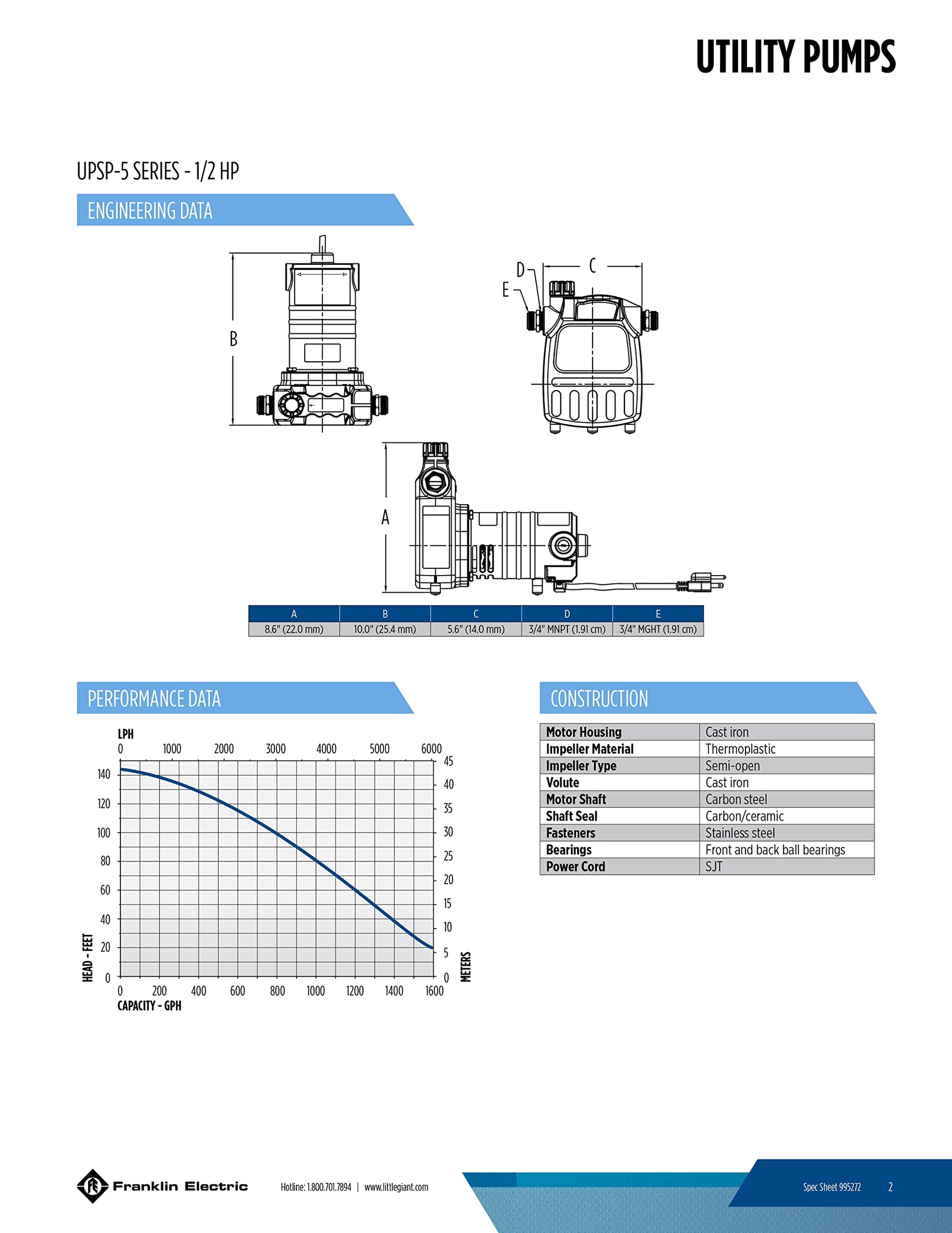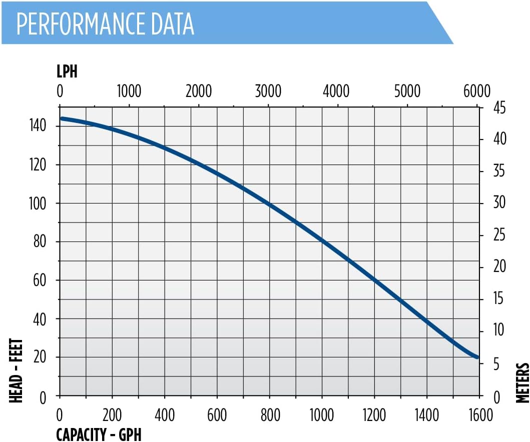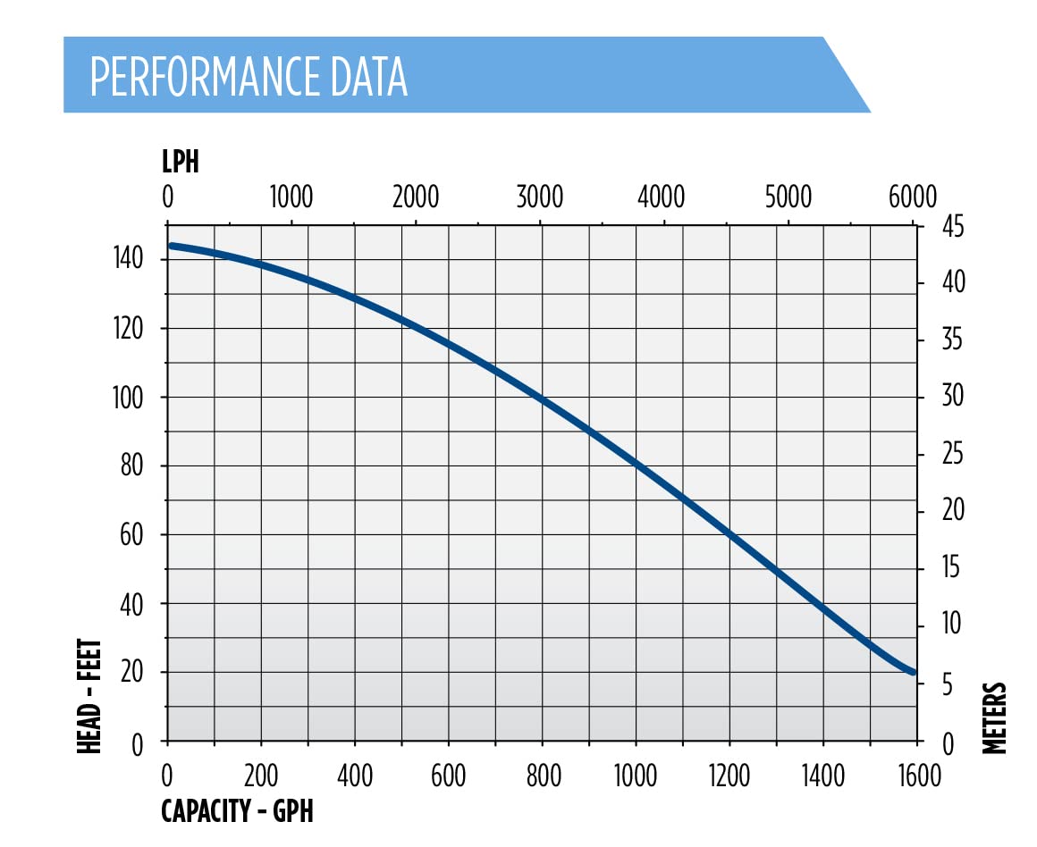 SPECIFICATIONS: 115-Volts, 10 running Amps, 1020 Watts, up to 1600 GPH at 20-ft. head, 10-ft. cord, 145-ft. shutoff, maximum 69.9 PSI