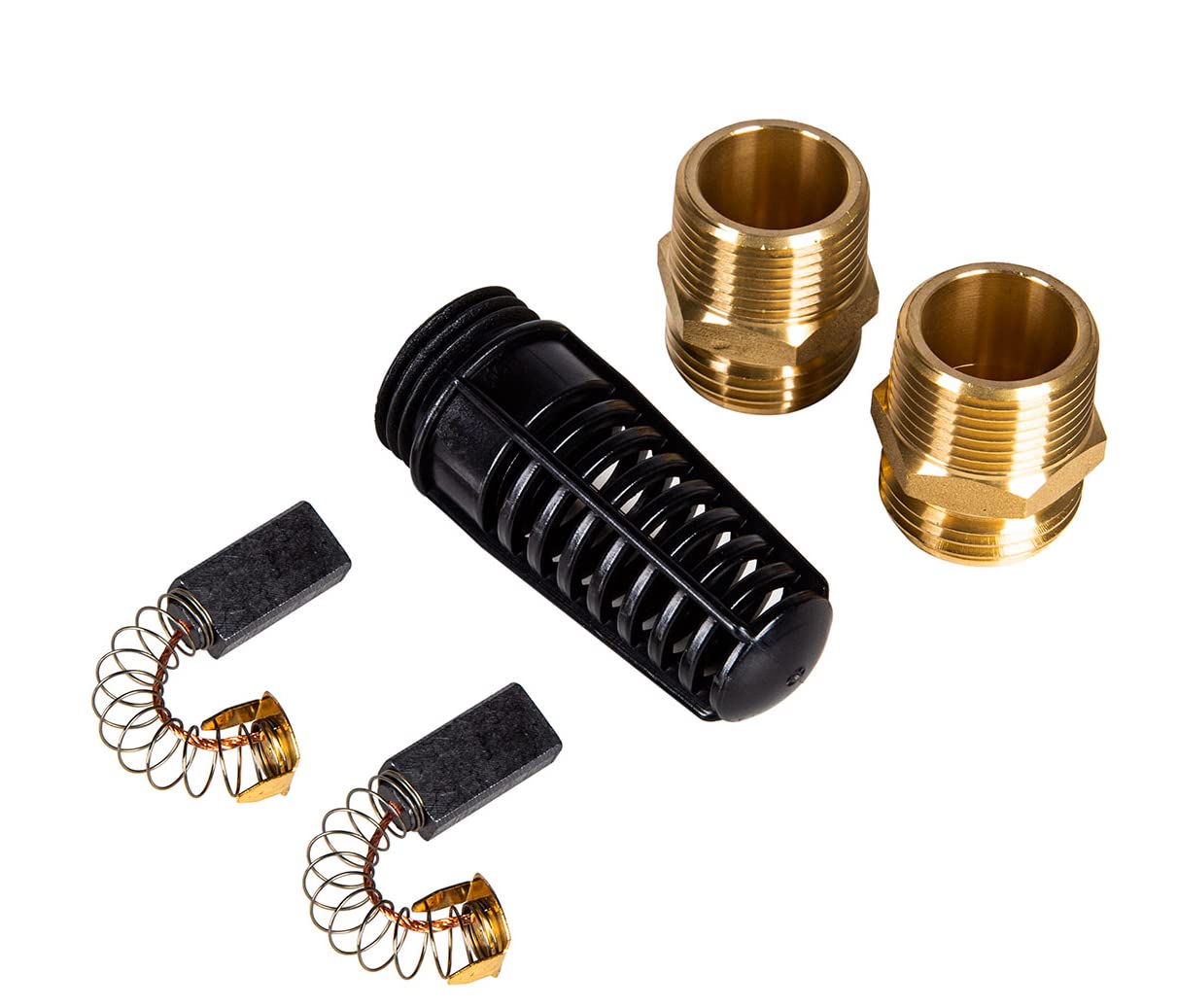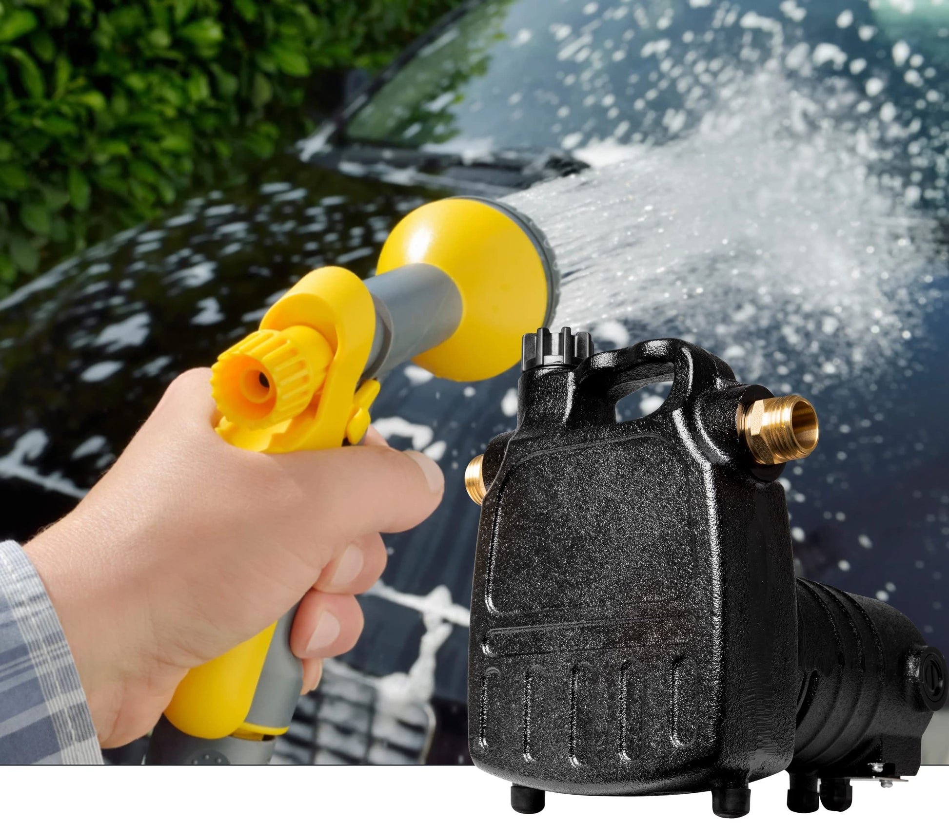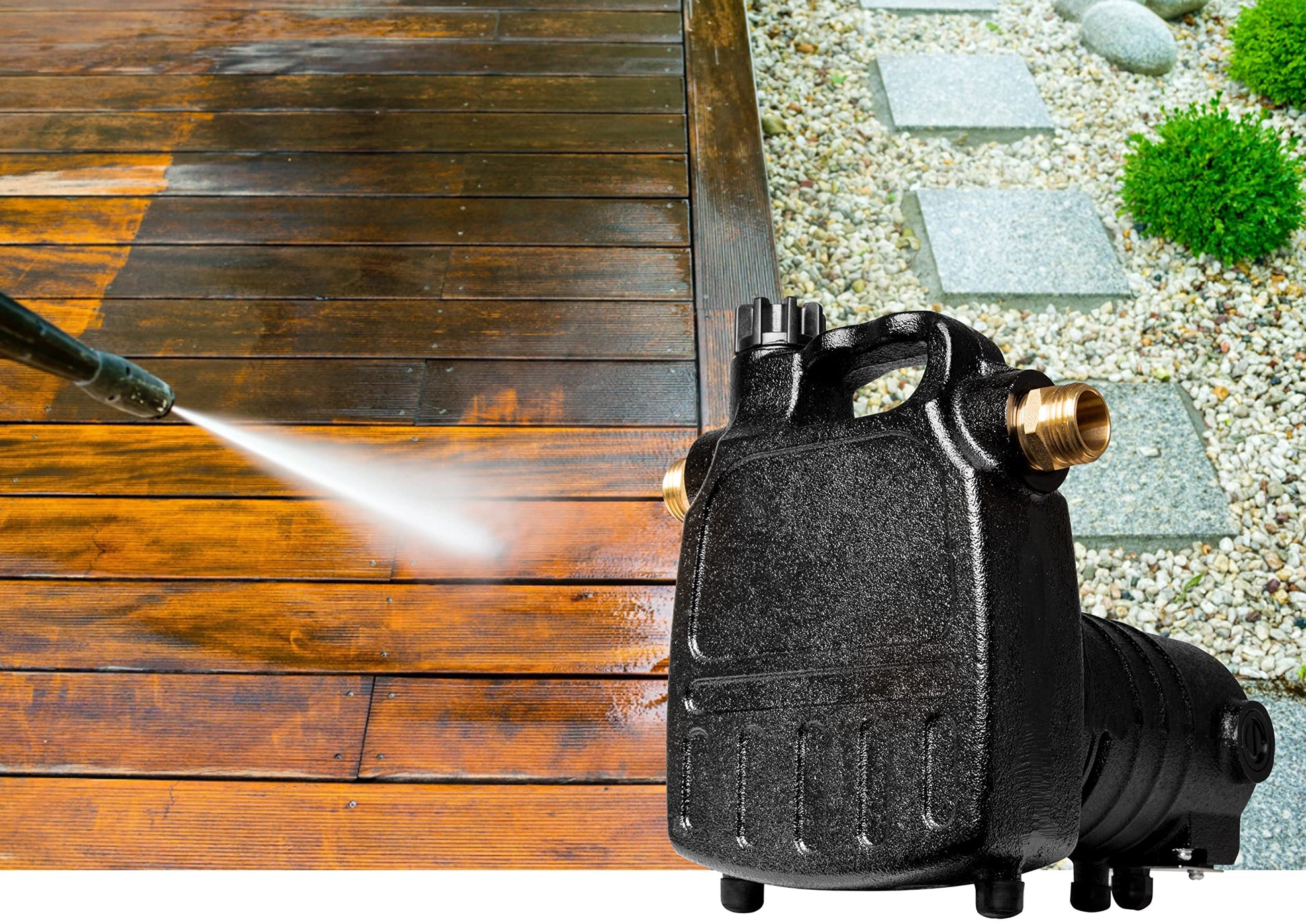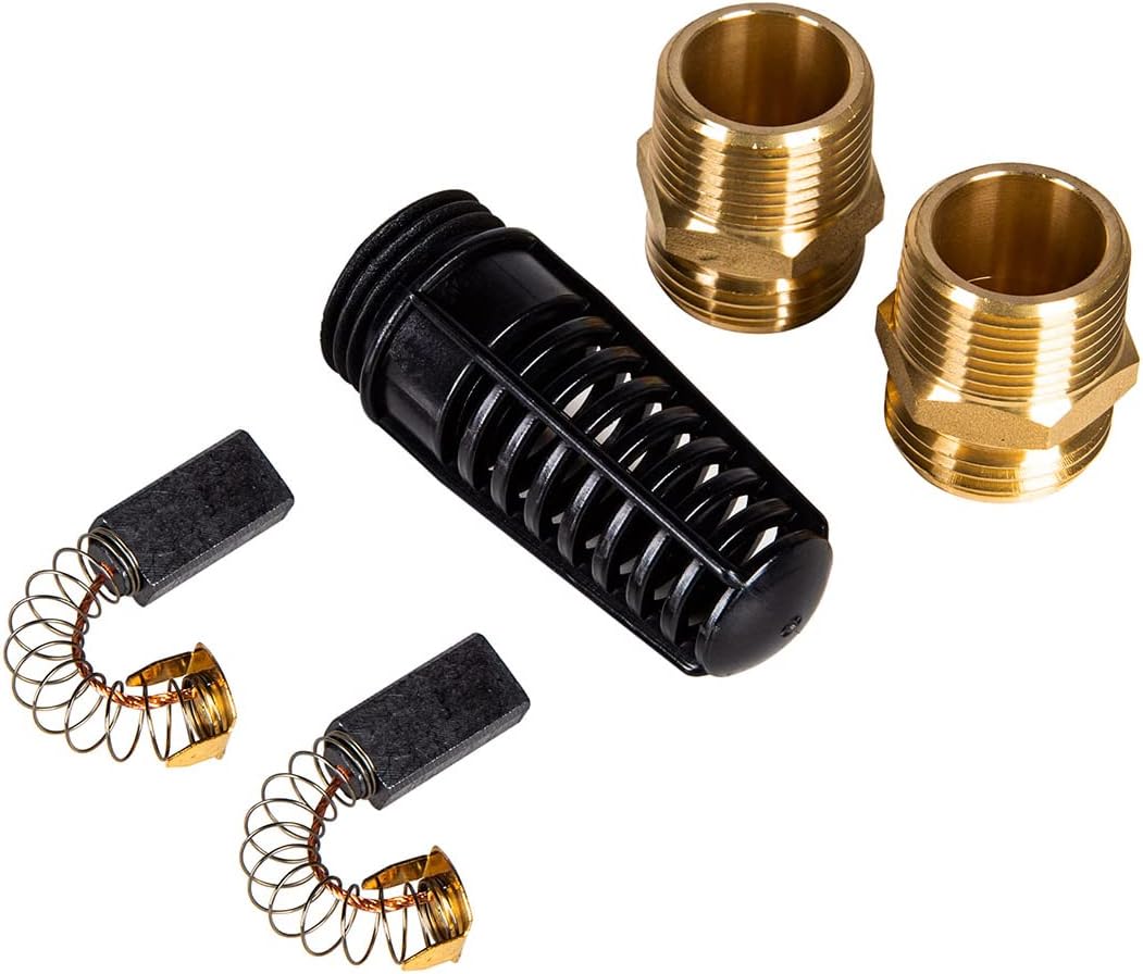 BUILT TO LAST: Heavy-duty cast iron construction, brass garden hose adapters, comes with strainer to prevent debris from damaging impeller, extra set of motor brushes included